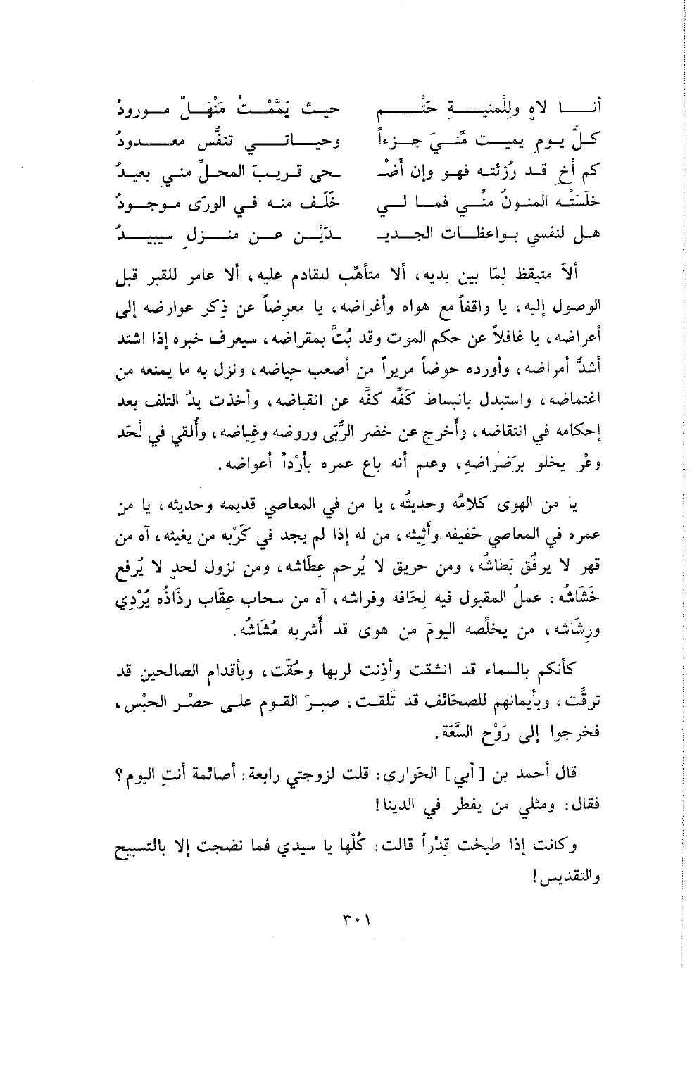 يَا مَنِ الْهَوَى كَلامُهُ وَحَدِيثُهُ , يَا مَنْ فِي الْمَعَاصِي قَدِيمُهُ وَحَدِيثُهُ , يَا مَنْ عُمْرُهُ فِي الْمَعَاصِي خَفِيفُهُ وَأَثِيثُهُ , مَنْ لَهُ إِذَا لَمْ يَجِدْ فِي كَرْبِهِ مَنْ يُغِيثُهُ , آهٍ مِنْ قَهْرٍ لا يَرْفُقُ بُطَّاشُهُ , وَمِنْ حَرِيقٍ لا يَرْحَمُ عُطَّاشَهُ , وَمِنْ نُزُولِ لَحْدٍ لا يُرْفَعُ خِشَاشُهُ , عَمَلُ الْمَقْبُولِ فِيهِ لِحَافُهُ وَفِرَاشُهُ , آهٍ مِنْ سَحَابِ عِقَابٍ رَذَاذُهُ يُرْدِي وَرَشَاشُهُ , مَنْ يُخَلِّصُهُ الْيَوْمَ مِنْ هوى قد أشربه مُشَاشُهُ.