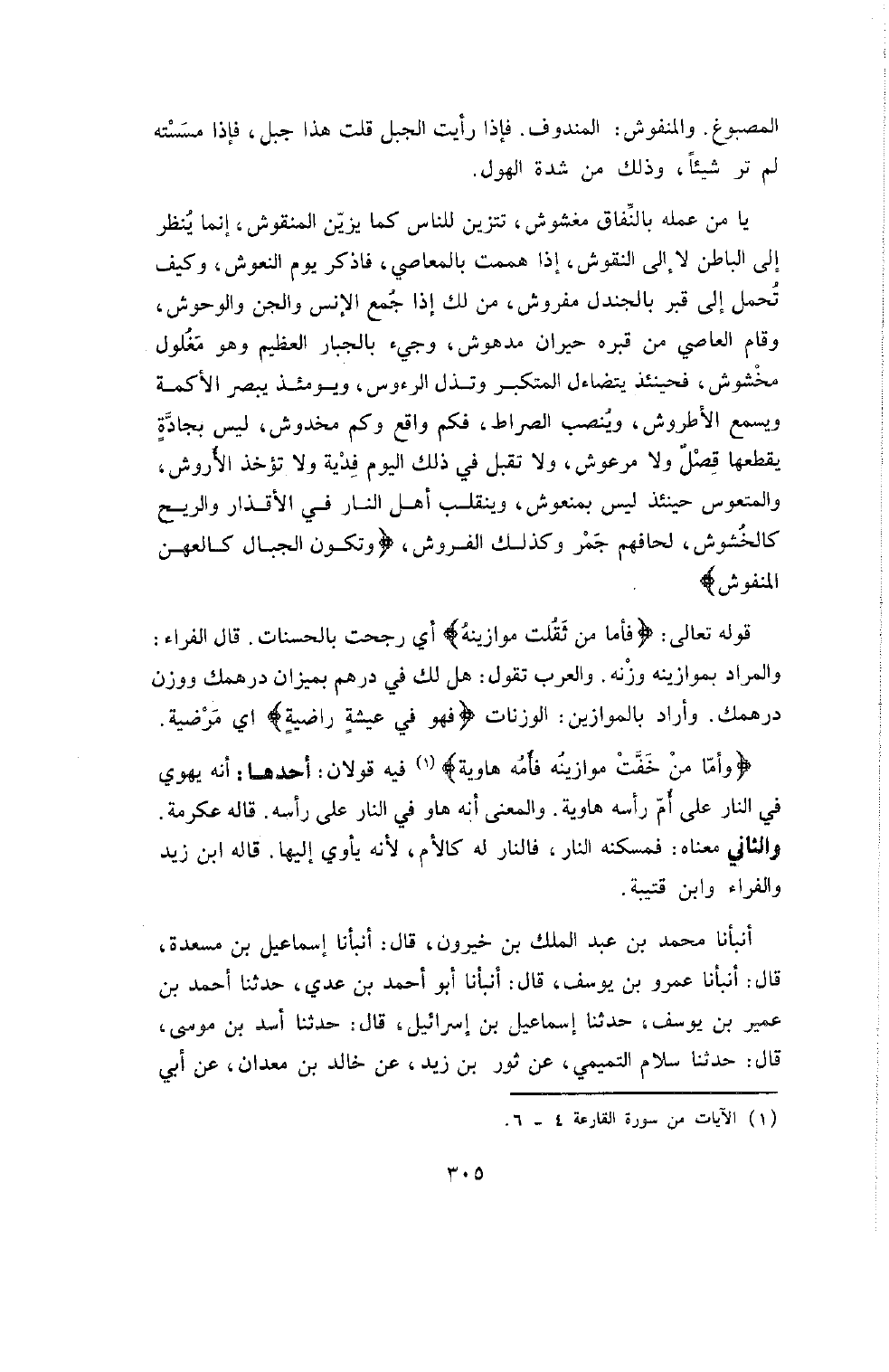 يَا مَنْ عَمَلُهُ بِالنِّفَاقِ مَغْشُوشٌ , تَتَزَيَّنُ لِلنَّاسِ كَمَا يَزِينُ الْمَنْقُوشُ , إِنَّمَا يُنْظَرُ إِلَى الْبَاطِنِ لا إِلَى النُّقُوشِ , إِذَا هَمَمْتَ بِالْمَعَاصِي فَاذْكُرْ يَوْمَ النُّعُوشِ , وَكَيْفَ تُحْمَلُ إِلَى قَبْرٍ بِالْجَنْدَلِ مَفْرُوشٍ , مَنْ لَكَ إِذَا جُمِعَ الإِنْسُ وَالْجِنُّ وَالْوُحُوشُ , وَقَامَ الْعَاصِي مِنْ قَبْرِهِ حيران مدهوش , وَجِيءَ بِالْجَبَّارِ الْعَظِيمِ وَهُوَ مَغْلُولٌ مَخْشُوشٌ , فَحِينَئِذٍ يَتَضَاءَلُ الْمُتَكَبِّرُ وَتُذَلُّ الرُّءُوسُ , وَيَوْمَئِذٍ يُبْصِرُ الأَكْمَهُ ويسمع الأطروش , وَيُنْصَبُ الصِّرَاطُ فَكَمْ وَاقِعٍ وَكَمْ مَخْدُوشٍ , لَيْسَ بِجَادَّةٍ يَقْطَعُهَا قَصْلٌ وَلا مَرْعُوشٌ , وَلا تُقْبَلُ فِي ذَلِكَ الْيَوْمِ فِدْيَةٌ وَلا تُؤْخَذُ الأُرُوشُ , وَالْمَتْعُوسُ حِينَئِذٍ لَيْسَ بِمَنْعُوشٍ , وَيَنْقَلِبُ أَهْلُ النَّارِ فِي الأَقْذَارِ وَالرِّيحُ كَالْحُشُوشِ , لِحَافُهُمْ جَمْرٌ وَكَذَلِكَ الفروش , {وتكون الجبال كالعهن المنفوش} .