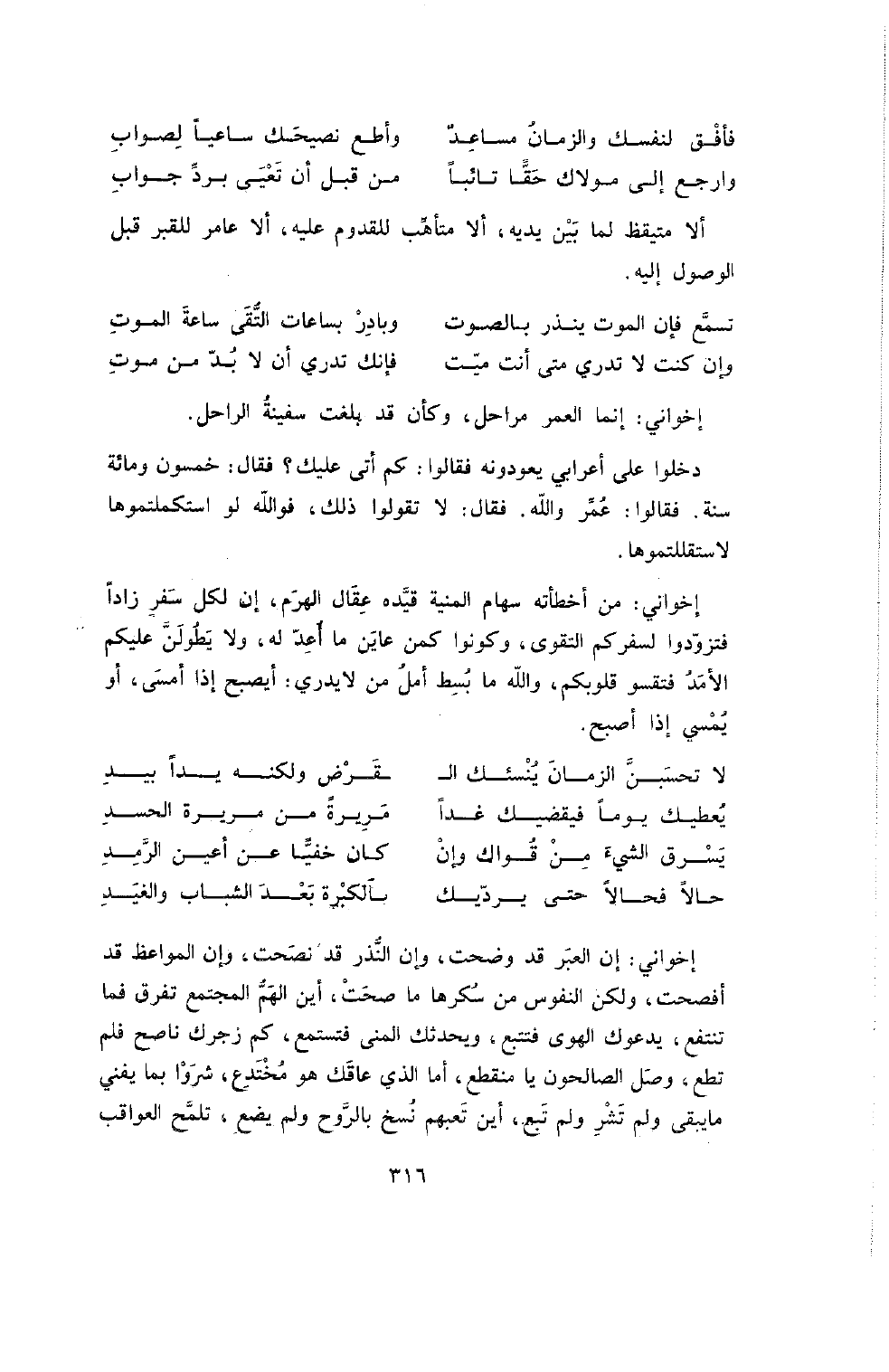 إِخْوَانِي: إِنَّ الْعِبَرَ قَدْ وَضَحَتْ , وَإِنَّ النُّذُرَ قَدْ نَصَحَتْ , وَإِنَّ الْمَوَاعِظَ قَدْ أَفْصَحَتْ , وَلَكِنَّ النُّفُوسَ مِنْ سُكْرِهَا مَا صَحَتْ , أَيْنَ الْهَمُّ الْمُجْتَمِعُ تَفَرَّقَ فَمَا تَنْتَفِعُ , يَدْعُوكَ الْهَوَى فَتَتَّبِعُ وَيُحَدِّثُكَ الْمُنَى فَتَسْتَمِعُ , كَمْ زَجَرَكَ نَاصِحٌ فَلَمْ تُطِعْ , وَصَلَ الصَّالِحُونَ يَا منقطع , أما الذي عاقك هو مُخْتَدِعٌ , شَرَوْا بِمَا يَفْنَى مَا يَبْقَى وَلَمْ تَشْرِ وَلَمْ تَبِعْ , أَيْنَ تَعَبُهُمْ نُسِخَ بِالرَّوْحِ وَلَمْ يَضِعْ , تَلَمَّحِ الْعَوَاقِبَ