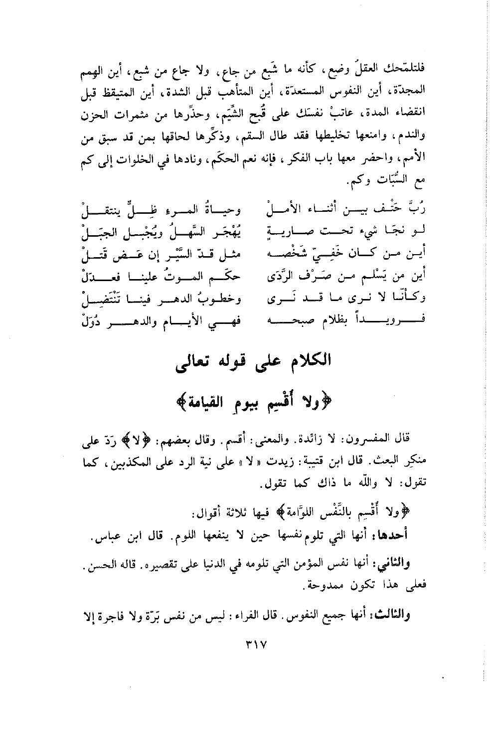 {وَلا أقسم بالنفس اللوامة} فِيهَا ثَلاثَةُ أَقْوَالٍ: أَحَدُهَا: أَنَّهَا الَّتِي تَلُومُ نَفْسَهَا حِينَ لا يَنْفَعُهَا اللَّوْمُ. قَالَهُ ابْنُ عَبَّاسٍ.