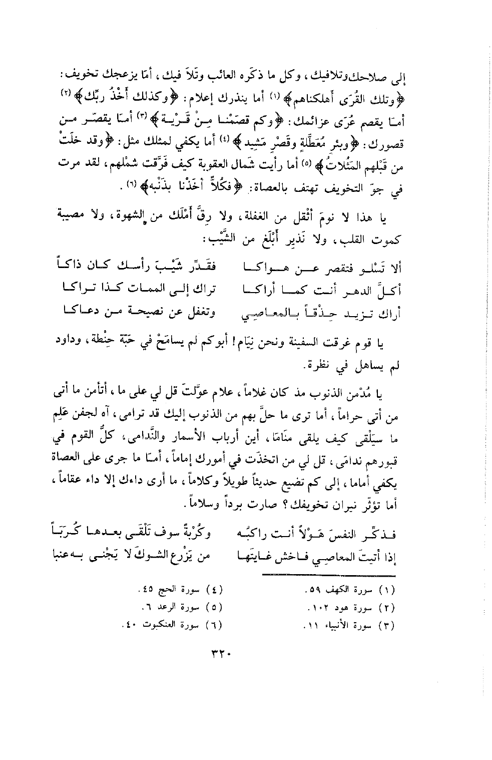 إِلَى صَلاحِكَ وَتَلافِيكَ , وَكُلُّ مَا ذَكَرَهُ الْعَائِبُ وَتَلا فِيكَ , أَمَا يُزْعِجُكَ تَخْوِيفٌ: {وَتِلْكَ الْقُرَى أهلكناهم} أما ينذرك إعلام: {وكذلك أخذ ربك} أما يقصم عرى عزائمك: {وكم قصمنا من قرية} أَمَا يُقْصِرُ مِنْ قُصُورِكَ: {وَبِئْرٍ مُعَطَّلَةٍ وَقَصْرٍ مشيد} أَمَا يَكْفِي لِمِثْلِكَ مَثَلٌ: {وَقَدْ خَلَتْ مِنْ قبلهم المثلات} أَمَا رَأَيْتَ شَمَالَ الْعُقُوبَةِ كَيْفَ فَرَّقَتْ شَمْلَهُمْ , لَقَدْ مَرَّتْ فِي جَوِّ التَّخْوِيفِ تَهْتِفُ بِالْعُصَاةِ: {فكلا أخذنا بذنبه} .