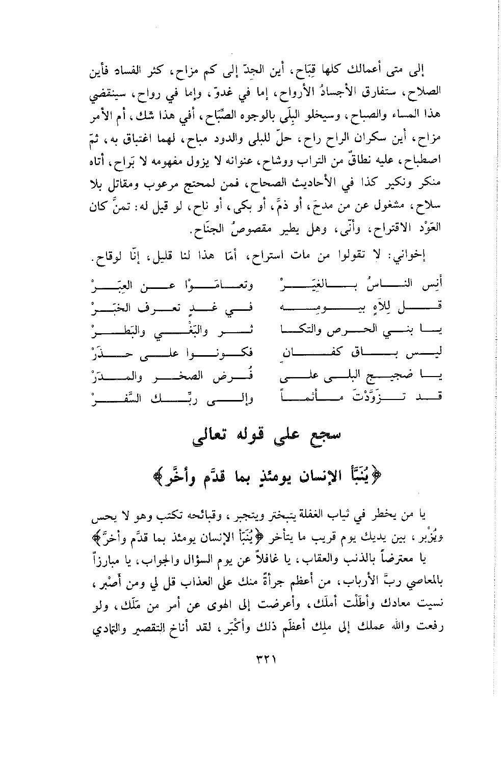 {يُنَبَّأُ الإِنْسَانُ يَوْمَئِذٍ بِمَا قَدَّمَ وَأَخَّرَ} يَا مَنْ يَخْطِرُ فِي ثِيَابِ الْغَفْلَةِ يَتَبَخْتَرُ وَيَتَجَبَّرُ , وَقَبَائِحُهُ تُكْتَبُ وَهُوَ لا يُحِسُّ وَيَزْبُرُ , بَيْنَ يَدَيْكَ يَوْمٌ قَرِيبٌ مَا يَتَأَخَّرُ {يُنَبَّأُ الإنسان يومئذ بما قدم وأخر} يَا مُتَعَرِّضًا بِالذَّنْبِ وَالْعِقَابِ , يَا غَافِلا عَنْ يَوْمِ السُّؤَالِ وَالْجَوَابِ , يَا مُبَارِزًا بِالْمَعَاصِي رَبَّ الأَرْبَابِ , مَنْ أَعْظَمُ جُرْأَةً مِنْكَ عَلَى الْعَذَابِ قُلْ لِي وَمَنْ أَصْبَرُ , نَسِيتَ مَعَادَكَ وَأَطَلْتَ أَمَلَكَ , وَأَعْرَضْتَ إِلَى الْهَوَى عَنْ أَمْرِ مَنْ مَلَكَ , وَلَوْ رَفَعْتَ وَاللَّهِ عَمَلَكَ إِلَى مَلِكٍ أعظم ذلك وأكبر , لقد أناح التقصير والتمادي