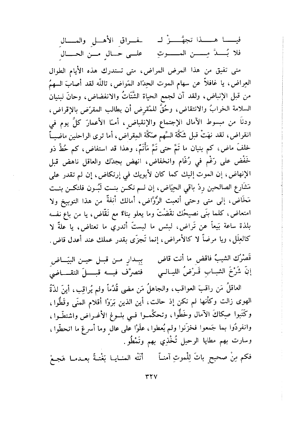 مَتَى تَفِيقُ مِنْ هَذَا الْمَرَضِ الْمِرَاضِ , مَتَى تَسْتَدْرِكُ هَذِهِ الأَيَّامَ الطِّوَالَ الْعِرَاضَ , يَا غَافِلا عَنْ سِهَامِ الْمَوْتِ الْحِدَادِ الْمَوَاضِ , تَاللَّهِ لَقَدْ أَصَابَ السَّهْمُ مِنْ قِبَلِ الأَنْبَاضِ , وَلَقَدْ آنَ لجمع الحياة الشتات والإنفضاض، وحان لبنيان السلامة الْخَرَابُ وَالانْتِقَاضُ , وَحَقٌّ لِلْمُقْرِضِ أَنْ يُطَالِبَ الْمُقْرَضَ بِالإِقْرَاضِ , وَدَنَا مِنْ مَبْسُوطِ الآمَالِ الاجْتِمَاعُ