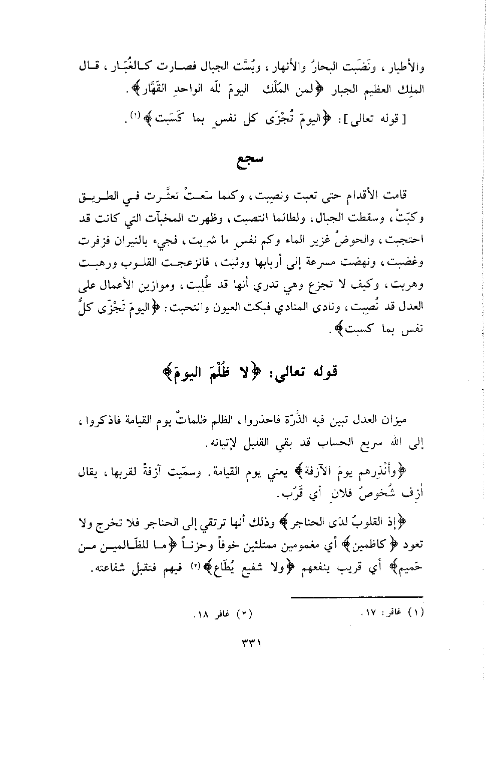 قَامَتِ الأَقْدَامُ حَتَّى تَعِبَتْ وَنَصَبَتْ , وَكُلَّمَا سعت تعثرت في الطريق وكبت , وسقطت الجبال ولطالما انتصبت , وظهر الْمُخَبَّآتُ الَّتِي كَانَتْ قَدِ احْتُجِبَتْ , وَالْحَوْضُ غَزِيرُ الْمَاءِ وَكَمْ نَفْسٍ مَا شَرِبَتْ , فَجِيءَ بِالنِّيرَانِ فَزَفَرَتْ وَغَضِبَتْ , وَنَهَضَتْ مُسْرِعَةً إِلَى أَرْبَابِهَا وَوَثَبَتْ , فَانْزَعَجَتِ الْقُلُوبُ وَرَهَبِتْ وَهَرَبَتْ , وَكَيْفَ لا تَجْزَعُ وَهِيَ تَدْرِي أَنَّهَا قَدْ طُلِبَتْ , وَمَوَازِينُ الأَعْمَالِ عَلَى الْعَدْلِ قَدْ نُصِبَتْ , وَنَادَى الْمُنَادِي فَبَكَتِ الْعُيُونُ وَانْتَحَبَتْ: {الْيَوْمَ تُجْزَى كُلُّ نَفْسٍ بِمَا كسبت} . قوله تعالى: {لا ظلم اليوم} مِيزَانُ الْعَدْلِ تَبِينُ فِيهِ الذَّرَّةُ فَاحْذَرُوا , الظُّلْمُ ظُلُمَاتٌ يَوْمَ الْقِيَامَةِ فَاذْكُرُوا , إِنَّ اللَّهَ سَرِيعُ الْحِسَابِ قَدْ بَقِيَ الْقَلِيلُ لإِتْيَانِهِ.