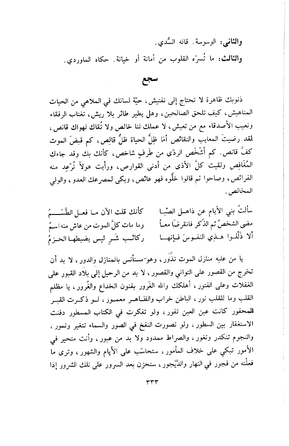 يَا مَنْ عَلَيْهِ مَنَازِلُ الْمَوْتِ تَدُورُ , وَهُوَ مُسْتَأْنِسٌ بِالْمَنَازِلِ وَالدُّورِ , لا بُدَّ أَنْ تَخْرُجَ مِنَ الْقُصُورِ عَلَى التَّوَانِي وَالْقُصُورِ , لا بُدَّ مِنَ الرَّحِيلِ إِلَى بِلادِ الْقُبُورِ عَلَى الْغَفَلاتِ وَعَلَى الْفُتُورِ , أَهْلَكَكَ وَاللَّهِ الْغُرُورُ بِفُنُونِ الْخِدَاعِ وَالْغُرُورِ , يَا مُظْلِمَ الْقَلْبِ وَمَا لِلْقَلْبِ نُورٌ , الْبَاطِنُ خَرَابٌ وَالظَّاهِرُ مَعْمُورٌ , لَوْ ذَكَرْتَ الْقَبْرَ الْمَحْفُورَ كَانَتْ عَيْنُ الْعَيْنِ تَفُورُ , وَلَوْ تَفَكَّرْتَ فِي الْكِتَابِ الْمَسْطُورِ دَفَنْتَ الاسْتِغْفَارَ بَيْنَ السُّطُورِ , وَلَوْ تَصَوَّرْتَ النَّفْخَ فِي الصُّورِ وَالسَّمَاءُ تَتَغَيَّرُ وَتَمُورُ , وَالنُّجُومُ تَنْكَدِرُ وَتَغُورُ , وَالصِّرَاطُ مَمْدُودٌ وَلا بُدَّ مِنْ عُبوُرٍ , وَأَنْتَ مُتَحَيِّرٌ فِي الأُمُورِ تَبْكِي عَلَى خِلافِ الْمَأْمُورِ , سَتُحَاسَبُ عَلَى الأَيَّامِ وَالشُّهُورِ , وَتَرَى مَا فَعَلْتَهُ مِنْ فُجُورٍ فِي النَّهَارِ وَالدَّيْجُورِ , سَتَحْزَنُ بَعْدَ السُّرُورِ عَلَى تِلْكَ الشُّرُورِ إِذَا