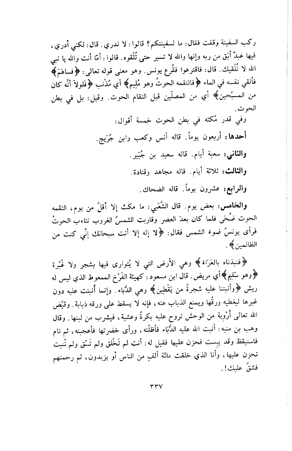 وَفِي قَدْرِ مُكْثِهِ في بطن الحوت خمسة أقوال: أحدها: أربعون يَوْمًا. قَالَهُ أَنَسٌ وَكَعْبٌ وَابْنُ جُرَيْجٍ. وَالثَّانِي: سَبْعَةَ أَيَّامٍ. قَالَهُ سَعِيدُ بْنُ جُبَيْرٍ. وَالثَّالِثُ: ثلاثة أيام. قاله مجاهد وقتادة. والرابع: عشرون يَوْمًا. قَالَهُ الضَّحَّاكُ. وَالْخَامِسُ. بَعْضَ يَوْمٍ. قَالَ الشَّعْبِيُّ: مَا مَكَثَ إِلا أَقَلَّ مِنْ يَوْمٍ , الْتَقَمَهُ الْحُوتُ ضُحًى فَلَمَّا كَانَ بَعْدَ الْعَصْرِ وَقَارَبَتِ الشَّمْسُ الْغُرُوبَ تَثَاءَبَ الْحُوتُ فَرَأَى يُونُسُ ضَوْءَ الشَّمْسِ فَقَالَ: " {لا إِلَهَ إِلا أَنْتَ سبحانك إني كنت من الظالمين} ".