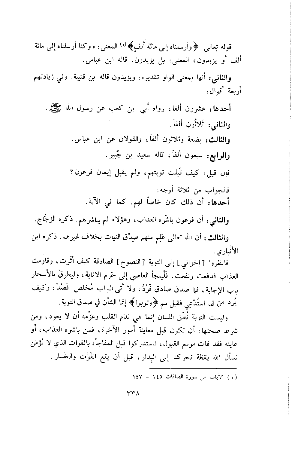 قوله تعالى: {وأرسلناه إلى مائة ألف} الْمَعْنَى: {وَكُنَّا أَرْسَلْنَاهُ إِلَى مِائَةِ أَلْفٍ أَوْ يزيدون} الْمَعْنَى: بَلْ يَزِيدُونَ. قَالَهُ ابْنُ عَبَّاسٍ. وَالثَّانِي: أَنَّهَا بِمَعْنَى الْوَاوِ تَقْدِيرُهُ: وَيَزِيدُونَ قَالَهُ ابْنُ قُتَيْبَةَ. وَفِي زِيَادَتِهِمْ أَرَبْعَةُ أَقْوَالٍ: أَحَدُهَا: عِشْرُونَ ألفاً. رواه أبي ابن كَعْبٍ عَنْ رَسُولِ اللَّهِ صَلَّى اللَّهُ عَلَيْهِ وَسَلَّمَ. وَالثَّانِي: ثَلاثُونَ أَلْفًا. وَالثَّالِثُ: بِضْعَةٌ