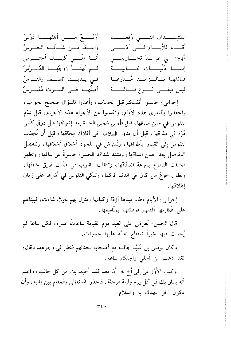 وَكَتَبَ الأَوْزَاعِيُّ إِلَى أَخٍ لَهُ: أَمَّا بَعْدُ فَقَدْ أُحِيطَ بِكَ مِنْ كُلِّ جَانِبٍ , وَاعْلَمْ أَنَّهُ يُسَارُ بِكَ فِي كُلِّ يَوْمٍ وَلَيْلَةٍ مَرْحَلَةٌ , فَاحْذَرِ اللَّهَ تَعَالَى وَالْمَقَامَ بَيْنَ يَدَيْهِ وَأَنْ يَكُونَ آخِرُ عَهْدِكَ بِهِ وَالسَّلامُ.