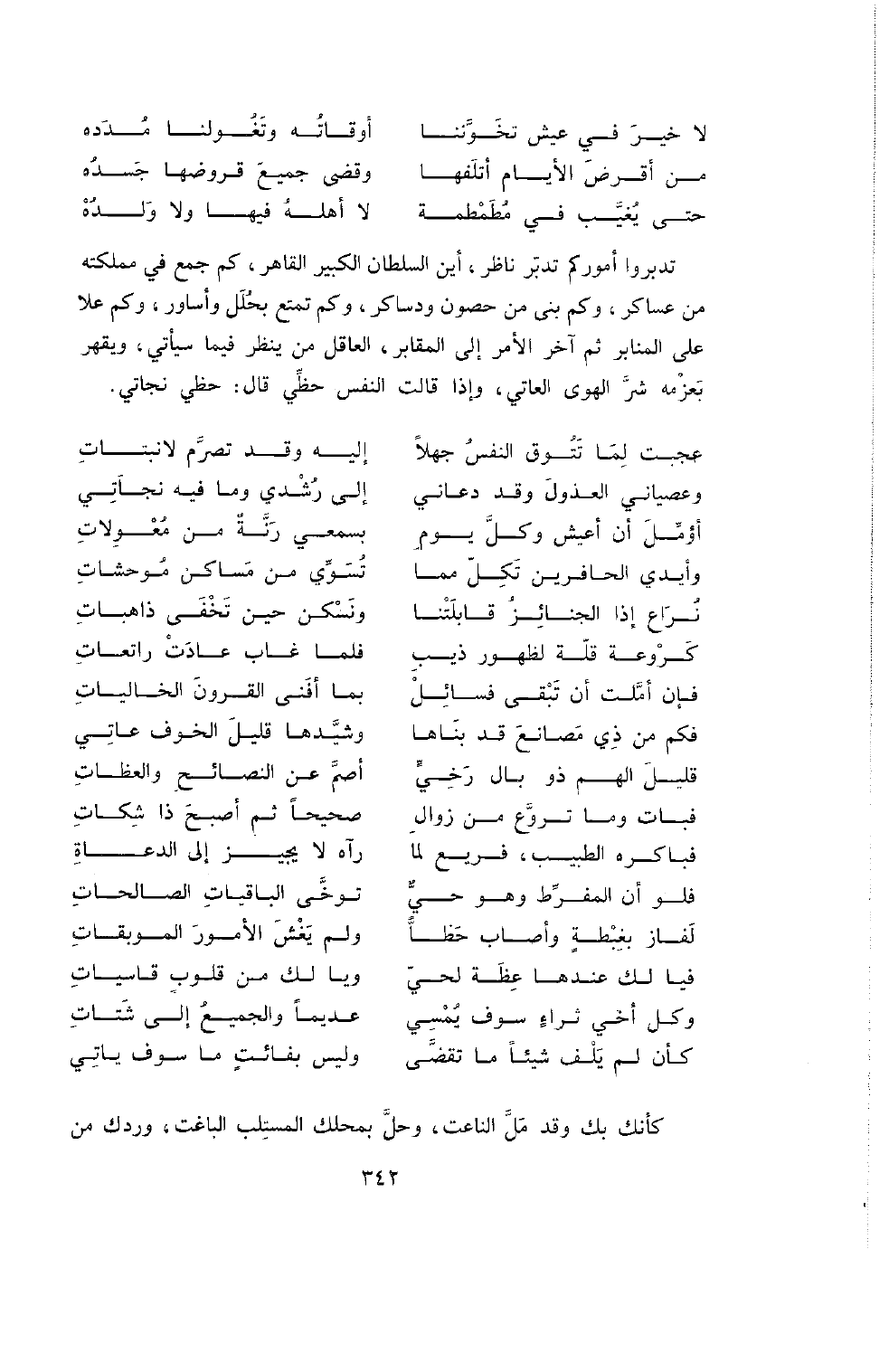 تدبروا أموكم تَدُبَّرَ نَاظِرٍ , أَيْنَ السُّلْطَانُ الْكَبِيرُ الْقَاهِرُ , كَمْ جَمَعَ فِي مَمْلَكَتِهِ مِنْ عَسَاكِرَ , وَكَمْ بَنَى مِنْ حُصُونٍ وَدَسَاكِرَ , وَكَمْ تَمَتَّعَ بِحُلَلٍ وَأَسَاوِرَ , وَكَمْ عَلا عَلَى الْمَنَابِرِ ثُمَّ آخِرَ الأَمْرِ إِلَى الْمَقَابِرِ , الْعَاقِلُ مَنْ يَنْظُرُ فِيمَا سَيَأْتِي وَيَقْهَرُ بِعَزْمِهِ شَرَّ الْهَوَى الْعَاتِي , وَإِذَا قَالَتِ النَّفْسُ حَظِّي قَالَ حَظِّي نَجَاتِي.
