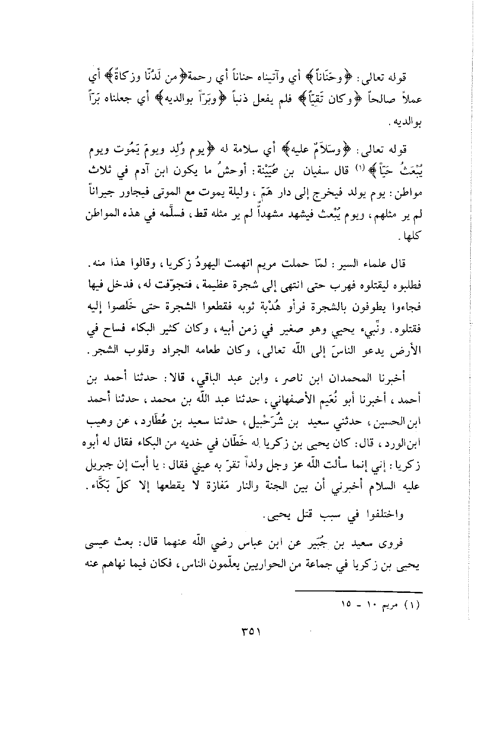 قَوْلُهُ تَعَالَى: {وَسَلامٌ عليه} أي سلامة لَهُ {يَوْمَ وُلِدَ وَيَوْمَ يَمُوتُ وَيَوْمَ يُبْعَثُ حيا} قال سفيان ابن عُيَيْنَةَ: أَوْحَشُ مَا يَكُونُ ابْنُ آدَمَ فِي ثلاث مواطن: يوم يولد فَيَخْرُجُ إِلَى دَارِ هَمٍّ , وَلَيْلَةَ يَمُوتُ مَعَ الْمَوْتَى فَيُجَاوِرُ جِيرَانًا لَمْ يَرَ مِثْلَهُمْ , وَيَوْمَ يُبْعَثُ فَيَشْهَدُ مَشْهَدًا لَمْ يَرَ مِثْلَهُ قَطُّ , فَسَلَّمَهُ فِي هَذِهِ الْمَوَاطِنِ كُلِّهَا.