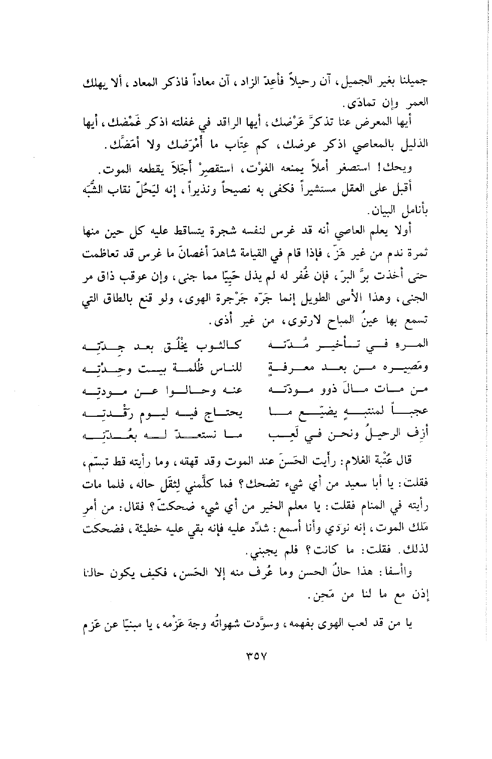 جَمِيلَنَا بِغَيْرِ الْجَمِيلِ , آنَ رَحِيلا فَأَعِدَّ الزَّادَ , آنَ مَعَادًا فَاذْكُرِ الْمَعَادَ , أَلا يَهْلِكُ الْعُمْرُ وَإِنْ تَمَادَى.