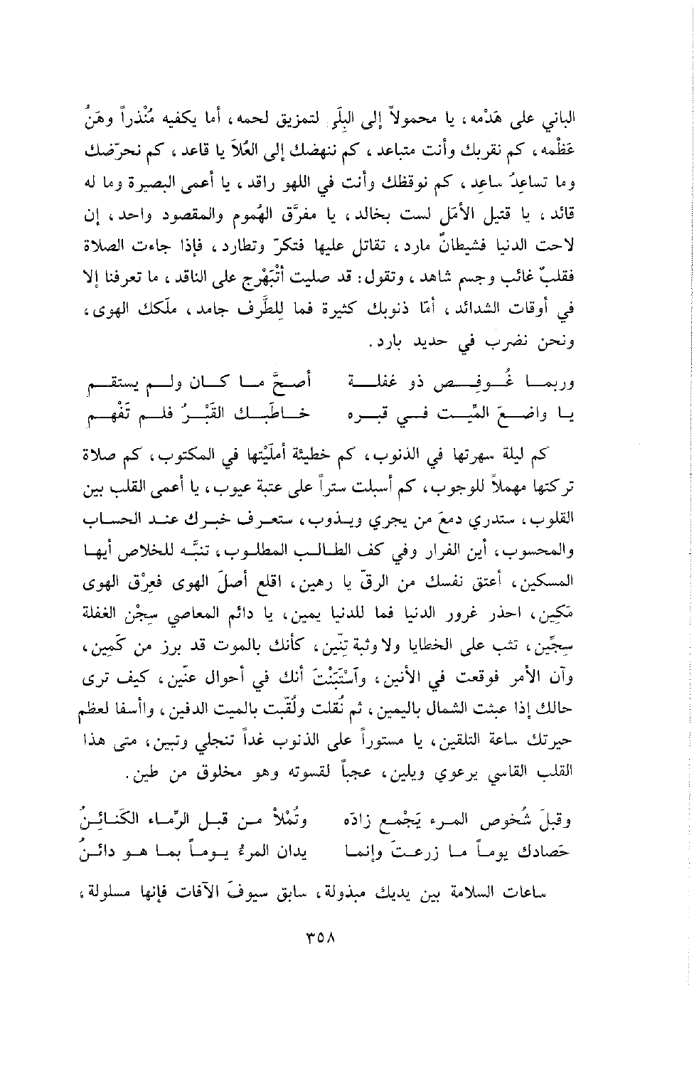الْبَانِي عَلَى هَدْمِهِ , يَا مَحْمُولا إِلَى الْبِلَى لِتَمْزِيقِ لَحْمِهِ , أَمَا يَكْفِيهِ مُنْذِرًا وَهْنُ عَظْمِهِ , كَمْ نُقَرِّبُكَ وَأَنْتَ مُتَبَاعِدٌ , كَمْ نُنْهِضُكَ إِلَى الْعُلا يَا قَاعِدُ , كَمْ نُحَرِّضُكَ وَمَا تُسَاعِدُ سَاعِدٌ , كَمْ نُوقِظُكَ وَأَنْتَ فِي اللَّهْوِ رَاقِدٌ , يَا أَعْمَى الْبَصِيرَةِ وَمَا لَهُ قَائِدٌ , يَا قَتِيلَ الأَمَلِ لَسْتَ بِخَالِدٍ , يَا مُفَرِّقَ الْهُمُومِ وَالْمَقْصُودُ وَاحِدٌ , إِنْ لاحَتِ الدُّنْيَا فَشَيْطَانٌ مَارِدٌ , تُقَاتِلُ عَلَيْهَا فَتَكِرُّ وَتُطَارِدُ , فَإِذَا جَاءَتِ الصَّلاةُ فَقَلْبٌ غَائِبٌ وَجِسْمٌ شَاهِدٌ , وَتَقُولُ قَدْ صَلَّيْتُ أَتُبَهْرِجُ عَلَى النَّاقِدِ , مَا تَعْرِفُنَا إِلا فِي أَوْقَاتِ الشَّدَائِدِ , أَمَّا ذُنُوبُكَ كَثِيرَةٌ فَمَا لِلطَّرْفِ جَامِدٌ , مَلَكَكَ الْهَوَى وَنَحْنُ نَضْرِبُ فِي حَدِيدٍ بَارِدٍ.