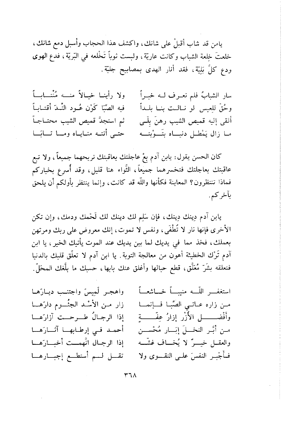 يَا مَنْ قَدْ شَابَ أَقْبِلْ عَلَى شَأْنِكَ , وَاكْشِفْ هَذَا الْحِجَابَ وَأَسْبِلْ دَمْعَ شَانِكَ , خَلَعْتَ خِلْعَةَ الشَّبَابِ وَكَانَتْ عَارِيَةً , وَلَبِسْتَ ثَوْبًا تَخْلَعُهُ فِي الْبَرِيَّةِ , فَدَعِ الْهَوَى وَدَعْ كُلَّ بَلِيَّةٍ , فَقَدْ أَنَارَ الْهُدَى بِمَصَابِيحَ جَلِيَّةٍ.