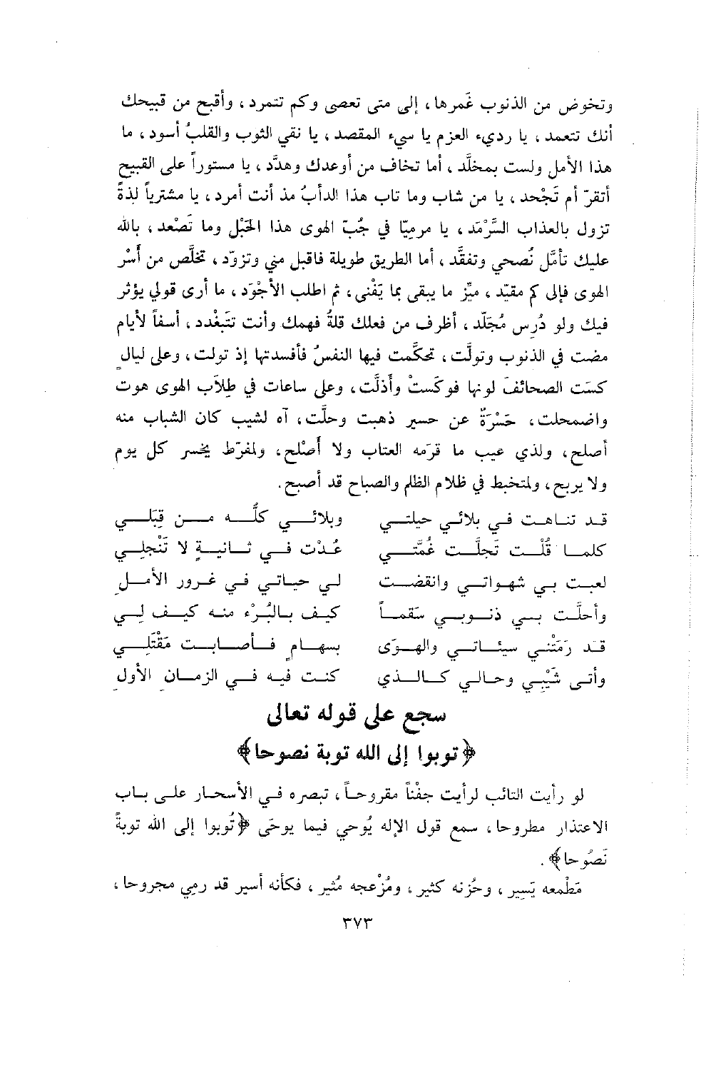 لَوْ رَأَيْتَ التَّائِبَ لَرَأَيْتَ جَفْنًا مَقْرُوحًا , تُبْصِرُهُ فِي الأَسْحَارِ عَلَى بَابِ الاعْتِذَارِ مَطْرُوحًا , سَمِعَ قَوْلَ الإِلَهِ يُوحَى فِيمَا يوحى {توبوا إلى الله توبة نصوحا} .