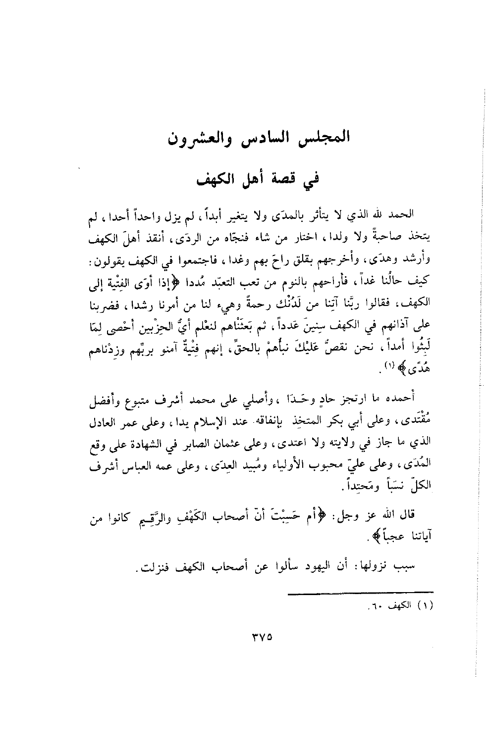 الْحَمْدُ للَّهِ الَّذِي لا يَتَأَثَّرُ بِالْمَدَى وَلا يَتَغَيَّرُ أَبَدًا , لَمْ يَزَلْ وَاحِدًا أَحَدًا , لَمْ يَتَّخِذْ صَاحِبَةً وَلا وَلَدًا , اخْتَارَ مَنْ شَاءَ فَنَجَّاهُ مِنَ الرَّدَى , أَنْقَذَ أَهْلَ الْكَهْفِ وَأَرْشَدَ وَهَدَى , وَأَخْرَجَهُمْ بِقَلَقٍ رَاحَ بِهِمْ وَغَدَا , فَاجْتَمَعُوا فِي الْكَهْفِ يَقُولُونَ كَيْفَ حَالُنَا غَدَا , فَأَرَاحَهُمْ بِالنَّوْمِ مِنْ تَعَبِ التعبد مدداً {إذا أَوَى الْفِتْيَةُ إِلَى الْكَهْفِ فَقَالُوا رَبَّنَا آتِنَا من لدنك رحمة وهيىء لَنَا مِنْ أَمْرِنَا رَشَدًا , فَضَرَبْنَا عَلَى آذَانِهِمْ في الكهف سنين عدداً , ثم بعثناهم لتعلم أَيُّ الْحِزْبَيْنِ أَحْصَى لِمَا لَبِثُوا أَمَدًا , نَحْنُ نَقُصُّ عَلَيْكَ نَبَأَهُمْ بِالْحَقِّ , إِنَّهُمْ فِتْيَةٌ آمَنُوا بربهم وزدناهم هدى} .