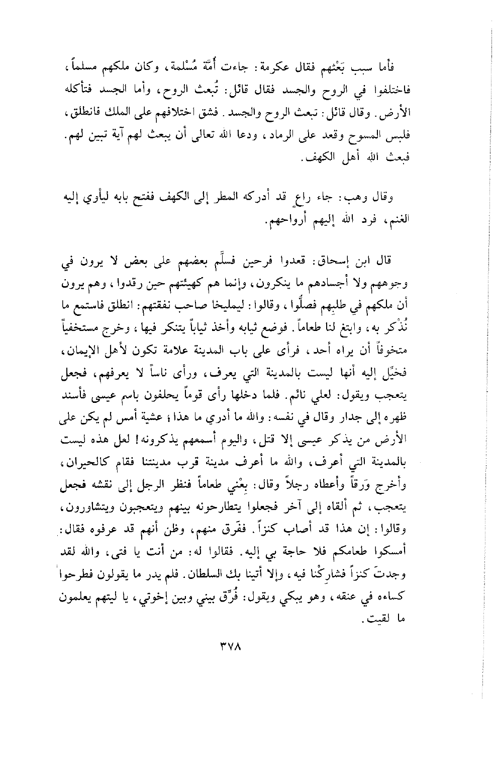 وَلا أَجْسَادِهِمْ مَا يُنْكِرُونَ , وَإِنَّمَا هُمْ كَهَيْئَتِهِمْ حِينَ رَقَدُوا , وَهُمْ يَرَوْنَ أَنَّ مَلِكَهُمْ فِي طَلَبِهِمْ فَصَلَّوْا وَقَالُوا لِيمليخَا صَاحِبِ نَفَقَتِهِمُ: انْطَلِقْ فَاسْتَمِعْ مَا نُذْكَرُ بِهِ وَابْتَغِ لَنَا طَعَامًا. فَوَضَعَ ثِيَابَهُ وَأَخَذَ ثِيَابًا يَتَنَكَّرُ فِيهَا , وَخَرَجَ مُسْتَخْفِيًا مُتَخَوِّفًا أَنْ يَرَاهُ أَحَدٌ , فَرَأَى عَلَى بَابِ الْمَدِينَةِ عَلامَةً تَكُونُ لأَهْلِ الإِيمَانِ , فَخُيِّلَ إِلَيْهِ أَنَّهَا لَيْسَتْ بِالْمَدِينَةِ الَّتِي يَعْرِفُ , وَرَأَى نَاسًا لا يَعْرِفُهُمْ , فَجَعَلَ يَتَعَجَّبُ وَيَقُولُ: لَعَلِّي نَائِمٌ. فَلَمَّا دَخَلَهَا رَأَى قَوْمًا يَحْلِفُونَ بِاسْمِ عِيسَى فَأَسْنَدَ ظَهْرَهُ إِلَى جِدَارٍ وَقَالَ فِي نَفْسِهِ: وَاللَّهِ مَا أَدْرِي مَا هَذَا؛ عَشِيَّةَ أَمْسٍ لَمْ يَكُنْ عَلَى الأَرْضِ مَنْ يَذْكُرُ عِيسَى إِلا قُتِلَ , وَالْيَوْمَ أَسْمَعُهُمْ يَذْكُرُونَهُ! لَعَلَّ هَذِهِ لَيْسَتْ بِالْمَدِينَةِ الَّتِي أَعْرِفُ , وَاللَّهِ مَا أَعْرِفُ مَدِينَةً قُرْبَ مَدِينَتِنَا فَقَامَ كَالْحَيْرَانِ وَأَخْرَجَ وَرِقًا وَأَعْطَاهُ رَجُلا وَقَالَ: بِعْنِي طَعَامًا فَنَظَرَ الرَّجُلُ إِلَى نَقْشِهِ فَجَعَلَ يَتَعَجَّبُ , ثُمَّ أَلْقَاهُ إِلَى آخَرَ فَجَعَلُوا يَتَطَارَحُونَهُ بَيْنَهُمْ وَيَتَعَجَّبُونَ وَيَتَشَاوَرُونَ , وَقَالُوا إِنَّ هَذَا قَدْ أَصَابَ كَنْزًا. فَفَرَقَ مِنْهُمْ وَظَنَّ أَنَّهُمْ قَدْ عَرَفُوهُ فَقَالَ: أَمْسِكُوا طَعَامَكُمْ فَلا حَاجَةَ بِي إِلَيْهِ. فَقَالُوا لَهُ: مَنْ أَنْتَ يَا فَتَى , وَاللَّهِ لَقَدْ وَجَدْتَ كَنْزًا فَشَارِكْنَا فِيهِ وَإِلا أَتَيْنَا بِكَ السُّلْطَانَ. فَلَمْ يَدْرِ مَا يَقُولُونَ فَطَرَحُوا كِسَاءَهُ فِي عُنُقِهِ وَهُوَ يَبْكِي وَيَقُولُ: فُرِّقَ بَيْنِي وَبَيْنَ إِخْوَتِي , يَا لَيْتَهُمْ يَعْلَمُونَ مَا لَقِيتُ.
