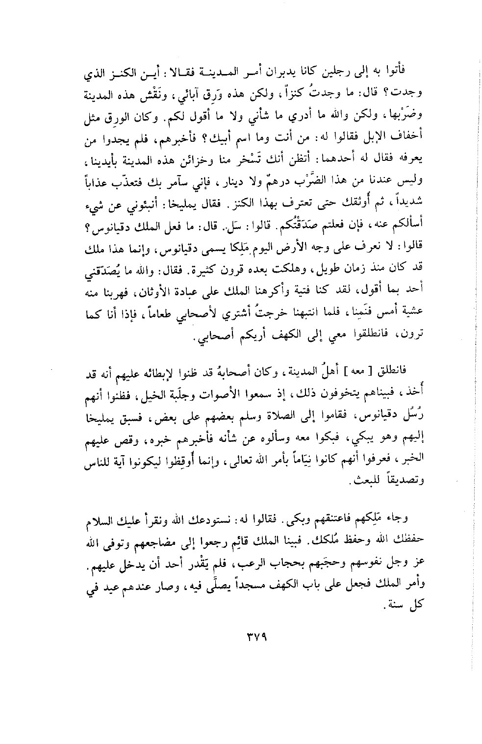 دِقْيَانُوسُ؟ قَالُوا: لا نَعْرِفُ عَلَى وَجْهِ الأَرْضِ الْيَوْمَ مَلِكًا يُسَمَّى دِقْيَانُوسَ , وَإِنَّمَا هَذَا ملك قد كان منذ زمان طَوِيلٍ , وَهَلَكَتْ بَعْدَهُ قُرُونٌ كَثِيرَةٌ. فَقَالَ: وَاللَّهِ مَا يُصَدِّقُنِي أَحَدٌ بِمَا أَقُولُ , لَقَدْ كُنَّا فِتْيَةً وَأَكْرَهَنَا الْمَلِكُ عَلَى عِبَادَةِ الأَوْثَانِ فَهَرَبْنَا مِنْهُ عَشِيَّةَ أَمْسِ فَنِمْنَا , فَلَمَّا انْتَبَهْنَا خَرَجْتُ أَشْتَرِي لأَصْحَابِي طَعَامًا فَإِذَا أَنَا كَمَا تَرَوْنَ , فَانْطَلِقُوا مَعِي إِلَى الْكَهْفِ أُرِيكُمْ أَصْحَابِي.