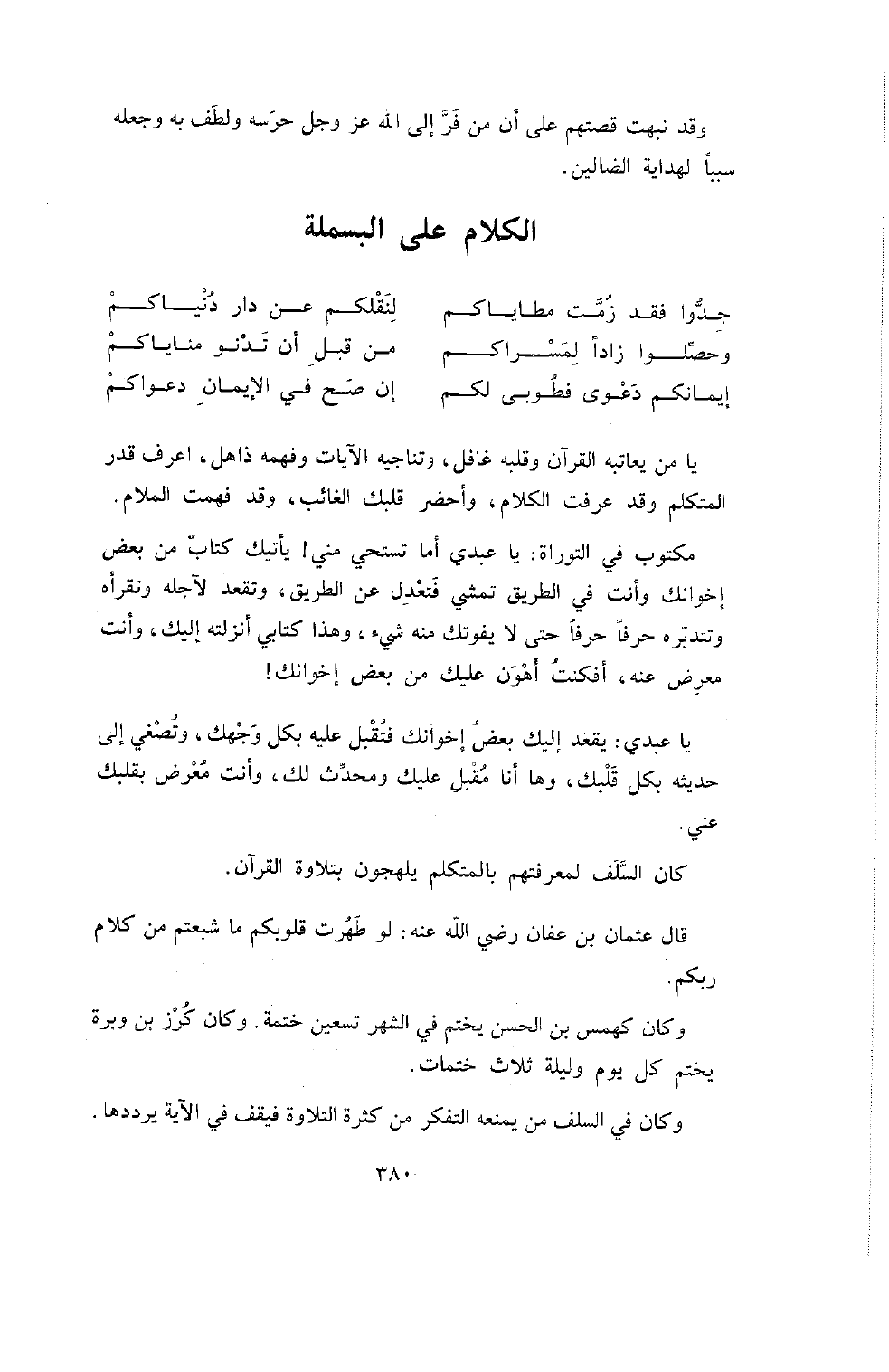 يَا مَنْ يُعَاتِبُهُ الْقُرْآنُ وَقَلْبُهُ غَافِلٌ , وَتُنَاجِيهِ الآيَاتُ وَفَهْمُهُ ذَاهِلٌ , اعْرِفْ قَدْرَ الْمُتَكَلِّمِ وَقَدْ عَرَفْتَ الْكَلامَ , وَأَحْضِرْ قَلْبَكَ الْغَائِبَ وَقَدْ فَهِمْتَ الْمَلامَ.