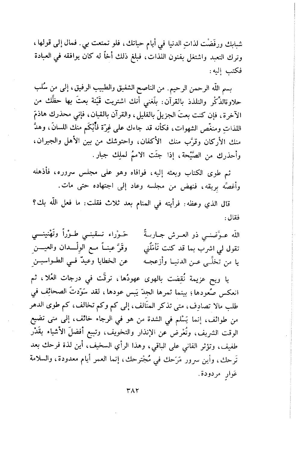 بِسْمِ اللَّهِ الرَّحْمَنِ الرَّحِيمِ. من الناصح الشفيق والطيب الرفيق , إلى مَنْ سُلِبَ حَلاوَةَ الذِّكْرِ وَالتَّلَذُّذَ بِالْقُرْآنِ: بَلَغَنِي أَنَّكَ اشْتَرَيْتَ قَيْنَةً بِعْتَ بِهَا حَظَّكَ مِنَ الآخِرَةِ , فَإِنْ كُنْتَ بِعْتَ الْجَزِيلَ بِالْقَلِيلِ وَالْقُرْآنَ بِالْقِيَانِ فَإِنِّي مُحَذِّرُكَ هَاذِمَ اللَّذَّاتِ وَمُنَغِّصَ الشَّهَوَاتِ , فَكَأَنَّهُ قَدْ جَاءَكَ عَلَى غِرَّةٍ فَأَبْكَمَ مِنْكَ اللسان وهدمتك الأركان وقرب