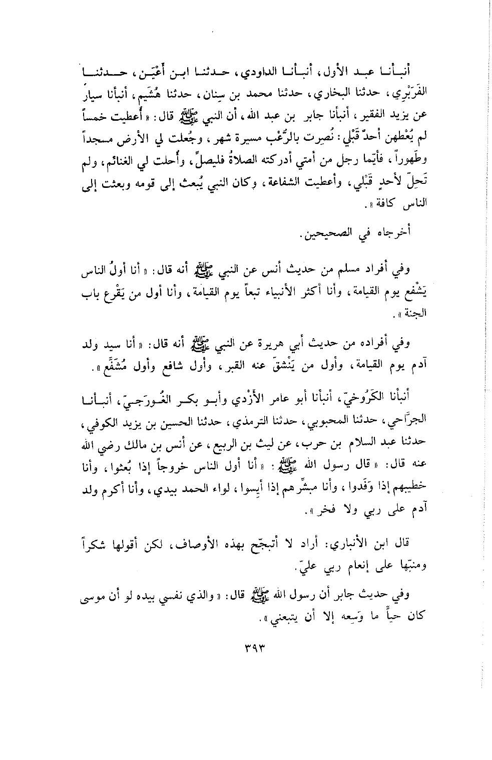 وَفِي أَفْرَادِ مُسْلِمٍ مِنْ حَدِيثِ أَنَسٍ عَنِ النَّبِيِّ صَلَّى اللَّهُ عَلَيْهِ وَسَلَّمَ أَنَّهُ قَالَ: " أَنَّا أَوَّلُ النَّاسِ يَشْفَعُ يَوْمَ الْقِيَامَةِ , وَأَنَا أَكْثَرُ الأَنْبِيَاءِ تَبَعًا يَوْمَ الْقِيَامَةِ , وَأَنَا أَوَّلُ مَنْ يَقْرَعُ بَابَ الْجَنَّةِ ".