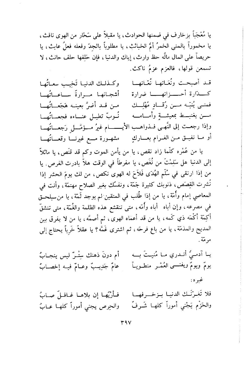 يَا مُعْجَبًا بِزَخَارِفَ فِي ضِمْنِهَا الْحَوَادِثُ , يَا مقبلاً على سحار مِنَ الْهَوَى نَافِثٍ , يَا مَخْمُورًا بِالْمُنَى الْخَمْرُ أُمُّ الْخَبَائِثِ , يَا مَطْلُوبًا بِالْجِدِّ وَفِعْلُهُ فِعْلُ عابث , يا حريصاً على المال ماله حَظُّ وَارِثٍ , إِيَّاكَ وَالدُّنْيَا فَإِنَّ حَلِفَهَا حَلِفُ حَانِثٍ , لا تَسْمَعَنَّ قَوْلَهَا فَالْعَزْمُ عَزْمُ نَاكِثٍ.