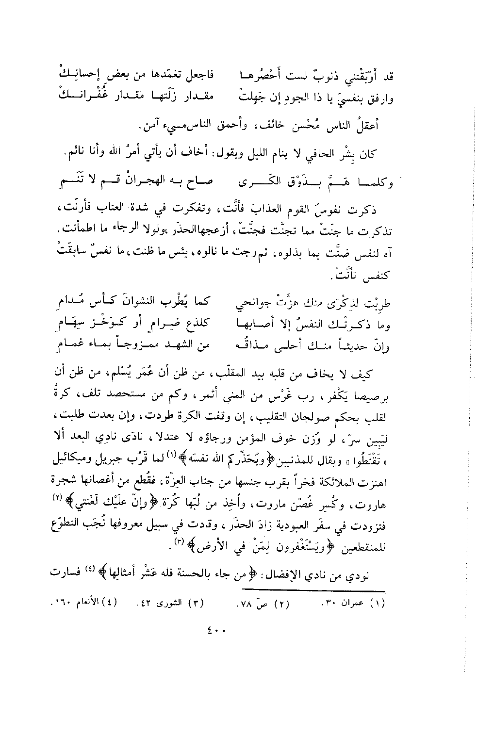 كَيْفَ لا يَخَافُ مَنْ قَلْبُهُ بِيَدِ الْمُقلِّبِ مَنْ ظَنَّ أَنَّ عمي يَسْلَمُ , مَنْ ظَنَّ أَنَّ برصِيصَا يَكْفُرُ , رُبَّ غَرْسٍ مِنَ الْمُنَى أَثْمَرَ , وَكَمْ مِنْ مُسْتَحْصَدٍ تَلِفَ , كَرَّةُ الْقَلْبِ بِحُكْمِ صَوْلَجَانِ التَّقْلِيبِ , إِنْ وَقَفَتِ الْكَرَّةُ طُرِدَتْ وَإِنْ بَعُدَتْ طُلِبَتْ , لِيَبِينَ سِرٌّ , لَوْ وُزِنَ خَوْفُ الْمُؤْمِنِ وَرَجَاؤُهُ لاعْتَدَلا , نادى نادي البعد ألا {تقنطوا} ويقال للمذنبين {ويحذركم الله نفسه} لَمَّا قُرِّبَ جِبْرِيلُ وَمِيكَائِيلُ اهْتَزَّتِ الْمَلائِكَةُ فَخْرًا بِقُرْبِ جِنْسِهَا مِنْ جَنَابِ الْعِزَّةِ , فَقَطَعَ مِنْ أَغْصَانِهَا شَجَرَةَ هَارُوتَ , وَكَسَرَ غُصْنَ مَارُوتَ , وَأَخَذَ من لبها كرة {وإن عليك لعنتي} فَتَزَوَّدَتْ فِي سَفَرِ الْعُبُودِيَّةِ زَادَ الْحَذَرِ , وَقَادَتْ فِي سَبِيلِ مَعْرُوفِهَا نُجُبَ التَّطَوُّعِ لِلْمُنْقَطِعِينَ {وَيَسْتَغْفِرُونَ لمن في الأرض} .