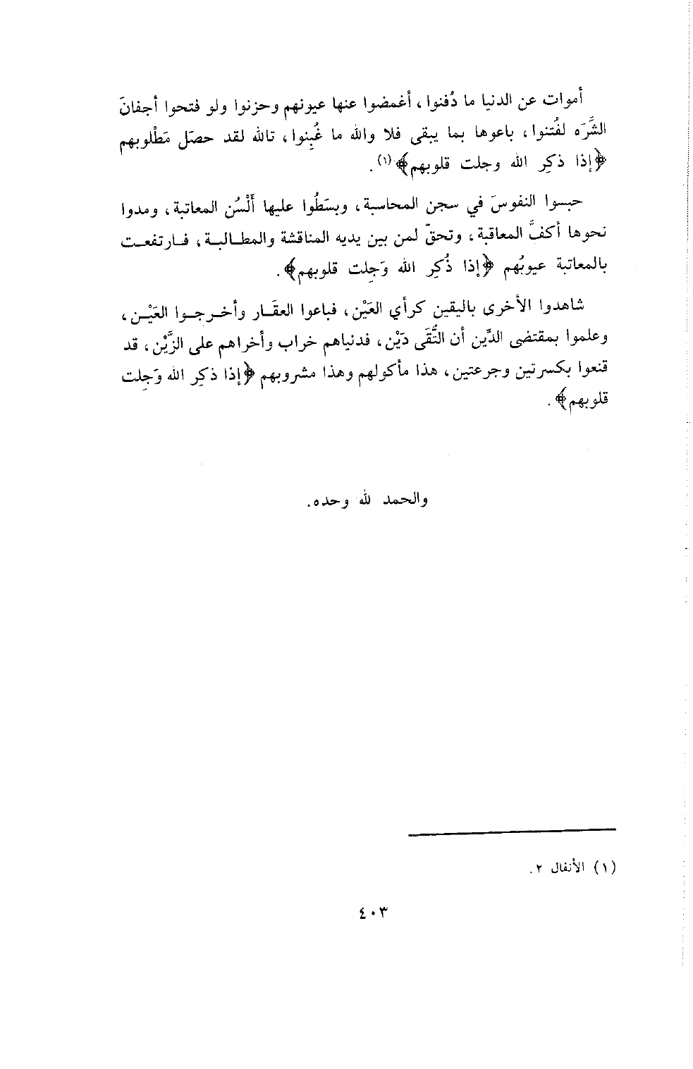 شَاهَدُوا الأُخْرَى بِالْيَقِينِ كَرَأْيِ الْعَيْنِ , فَبَاعُوا الْعَقَارَ وَأَخْرَجُوا الْعِينَ , وَعَلِمُوا بِمُقْتَضَى الدِّينِ أَنَّ التُّقَى دَيْنٌ , فَدُنْيَاهُمْ خَرَابٌ وَأُخْرَاهُمْ عَلَى الزَّيْنِ , قَدْ قَنَعُوا بِكِسْرَتَيْنِ وَجَرْعَتَيْنِ , هَذَا مَأْكُولُهُمْ وَهَذَا مَشْرُوبُهُمْ {إذا ذكر الله وجلت قلوبهم} . والحمد لله وحده.