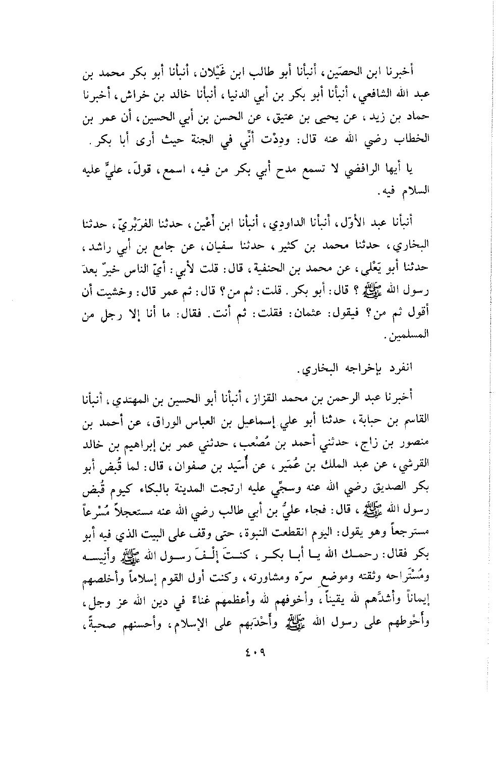 أَنْبَأَنَا عَبْدُ الأَوَّلِ , أَنْبَأَنَا الدَّاوُدِيُّ , أَنْبَأَنَا ابْنُ أَعْيَنَ , حَدَّثَنَا الْفَرَبْرِيُّ , حَدَّثَنَا الْبُخَارِيُّ , حَدَّثَنَا مُحَمَّدُ بْنُ كَثِيرٍ , حَدَّثَنَا سُفْيَانُ , عَنْ جَامِعِ بْنِ أَبِي رَاشِدٍ , حَدَّثَنَا أَبُو يَعْلَى , عَنْ مُحَمَّدِ بن الْحَنَفِيَّةِ , قَالَ: قُلْتُ لأَبِي: أَيُّ النَّاسِ خَيْرٌ بَعْدَ رَسُولِ اللَّهِ صَلَّى اللَّهُ عَلَيْهِ وَسَلَّمَ؟ قَالَ: أَبُو بَكْرٍ. قُلْتُ: ثُمَّ مَنْ؟ قَالَ: ثُمَّ عُمَرُ. قَالَ: وَخَشِيتُ أَنْ أَقُولَ ثُمَّ مَنْ؟ فَيَقُولُ: عُثْمَانُ. فَقُلْتُ: ثُمَّ أَنْتَ. فَقَالَ مَا أَنَا إِلا رَجُلٌ مِنَ الْمُسْلِمِينَ.