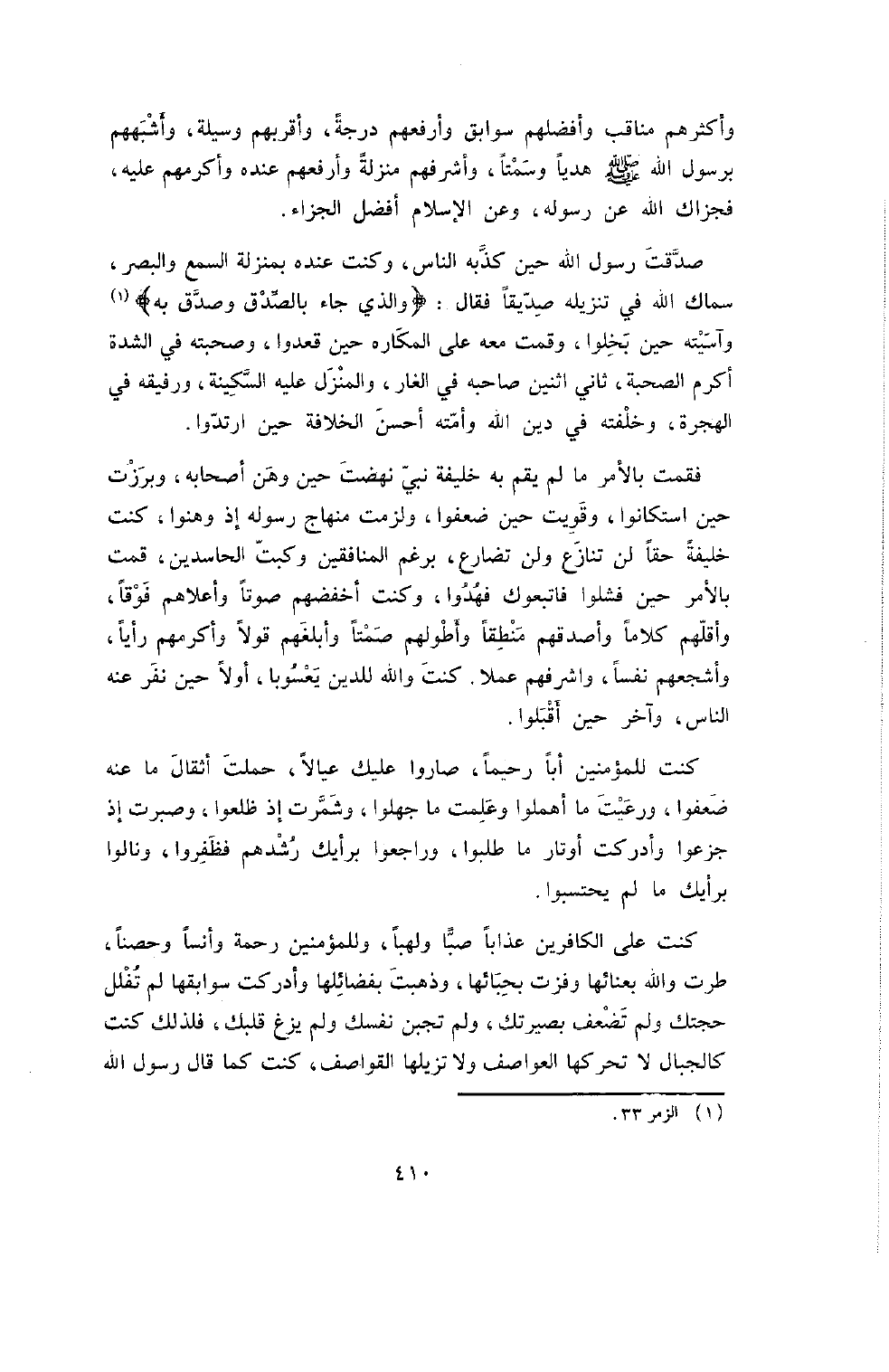 فَقُمْتَ بِالأَمْرِ مَا لَمْ يَقُمْ بِهِ خَلِيفَةُ نَبِيٍّ , نَهَضْتَ حِينَ وَهَنَ أَصْحَابُهُ , وَبَرَزْتَ حِينَ اسَتْكَانُوا , وَقَوِيتَ حِينَ ضَعُفُوا , وَلَزِمْتَ مِنْهَاجَ رَسُولِهِ إِذْ وَهَنُوا , كُنْتَ خَلِيفَةَ حَقًّا لَنْ تُنَازَعَ وَلَنْ تُضَارَعَ , بِرَغْمِ الْمُنَافِقِينَ وَكَبْتِ الْحَاسِدِينَ , قُمْتَ بِالأَمْرِ حِينَ فَشِلُوا فَاتَّبَعُوكَ فَهُدُوا , وَكُنْتَ أَخْفَضَهُمْ صَوْتًا وَأَعْلاهُمْ فَوْقًا , وَأَقَلَّهُمْ كَلامًا وَأَصْدَقَهُمْ مَنْطِقًا وَأَطْوَلَهُمْ صَمْتًا وَأَبْلَغَهُمْ قَوْلا وَأَكْرَمَهُمْ رَأْيًا , وَأَشْجَعَهُمْ نَفْسًا , وَأَشْرَفَهُمْ عَمَلا. كُنْتَ وَاللَّهِ لِلدِّينِ يَعْسُوبًا , أَوَّلا حِينَ نَفَرَ عَنْهُ النَّاسُ وَآخِرًا حِينَ أَقْبَلُوا.