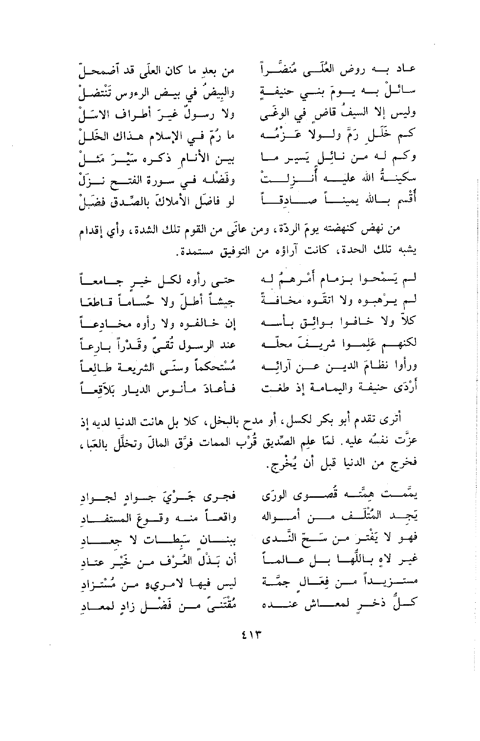 مَنْ نَهَضَ كَنَهْضَتِهِ يَوْمَ الرِّدَّةِ , وَمَنْ عَانَى مِنَ الْقَوْمِ تِلْكَ الشِّدَّةَ , وَأَيُّ إِقْدَامٍ يُشْبِهُ تِلْكَ الْحِدَّةَ , كَانَتْ آرَاؤُهُ مِنَ التَّوْفِيقِ مُسْتَمَدَّةً.