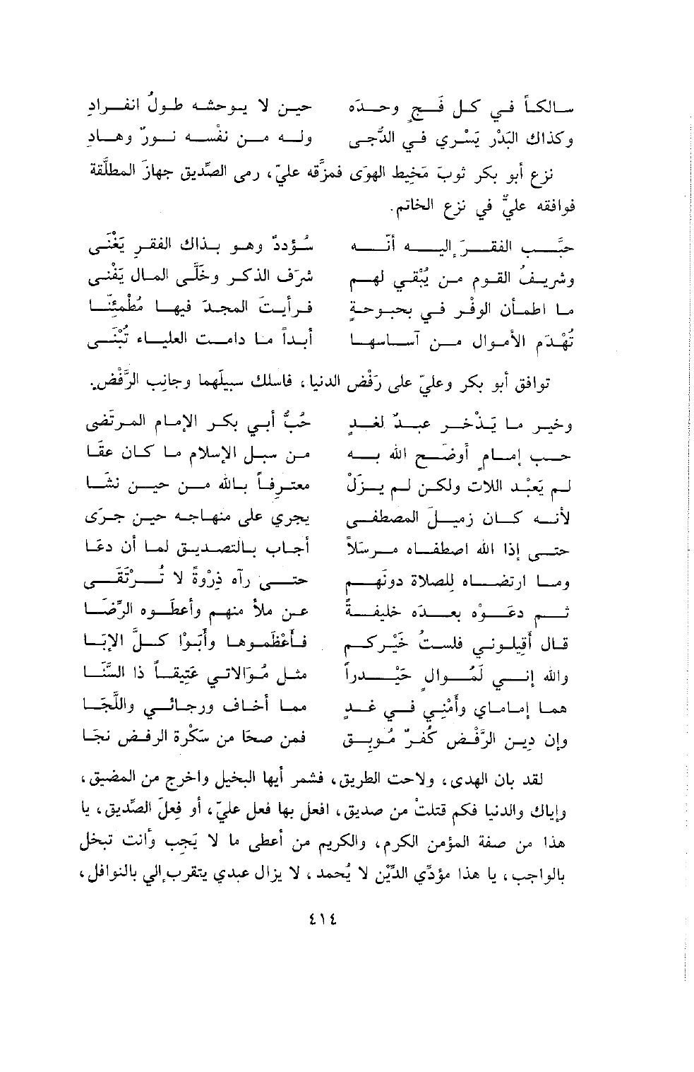 لَقَدْ بَانَ الْهُدَى وَلاحَتِ الطَّرِيقُ , فَشَمِّرْ أَيُّهَا الْبَخِيلُ وَاخْرُجْ مِنَ الْمَضِيقِ , وَإِيَّاكَ وَالدُّنْيَا فَكَمْ قَتَلَتْ مِنْ صَدِيقٍ , افْعَلْ بِهَا فِعْلَ عَلِيٍّ أَوْ فِعْلَ الصِّدِّيقِ , يَا هَذَا مِنْ صِفَةِ الْمُؤْمِنِ الْكَرَمُ , وَالْكَرِيمُ مَنْ أَعْطَى مَا لا يَجِبُ وَأَنْتَ تَبْخَلُ بِالْوَاجِبِ , يَا هَذَا مُؤَدِّي الدِّينِ لا يُحْمَدُ , لا يَزَالُ عَبْدِي يَتَقَرَّبُ إِلَيَّ بِالنَّوَافِلِ ,