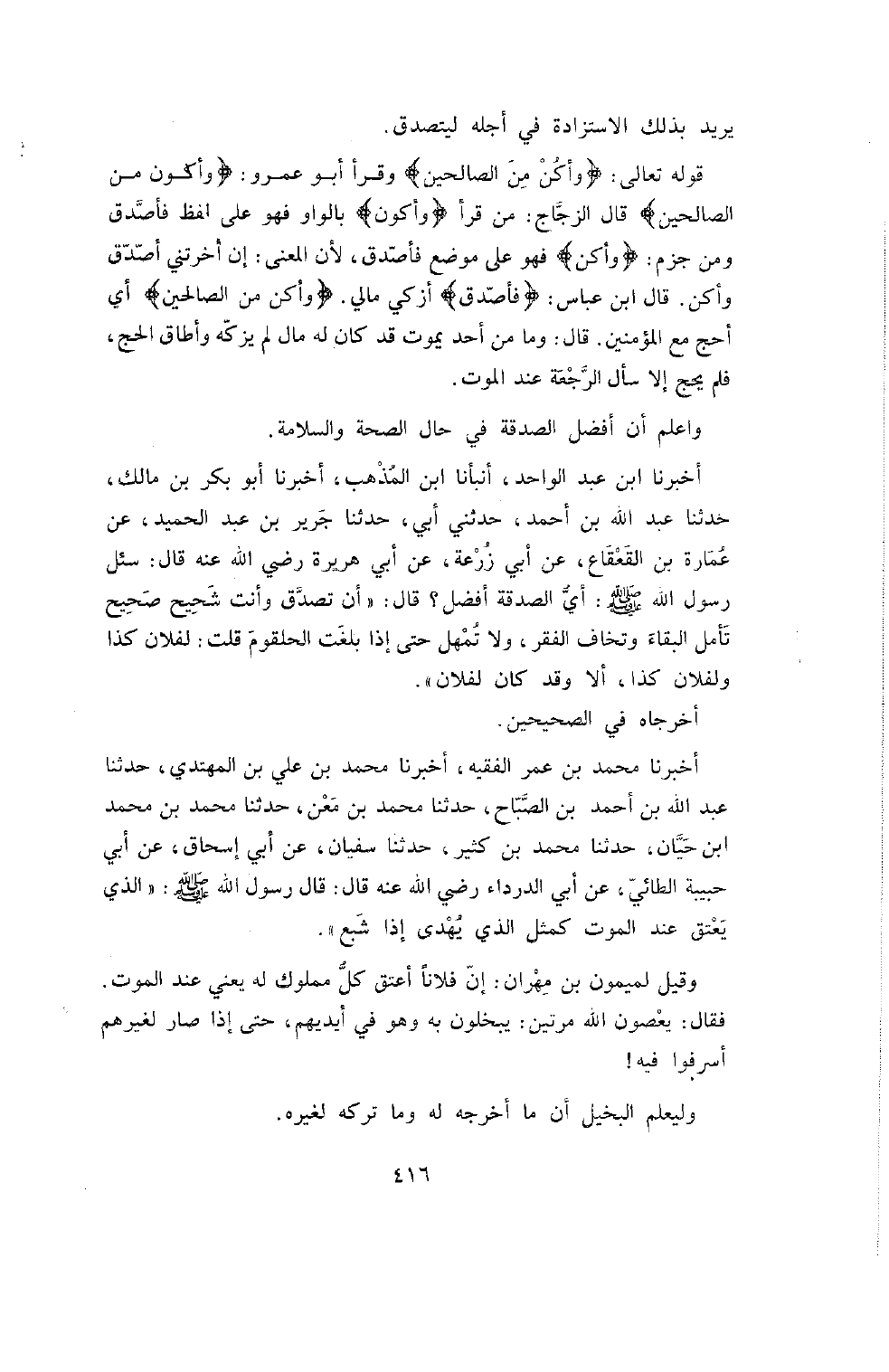 عَبْدُ اللَّهِ بْنُ أَحْمَدَ , حَدَّثَنِي أَبِي , حَدَّثَنَا جَرِيرُ بْنُ عَبْدِ الْحَمِيدِ , عَنْ عُمَارَةَ بْنِ الْقَعْقَاعِ , عَنْ أَبِي زُرْعَةَ , عَنْ أَبِي هُرَيْرَةَ رَضِيَ اللَّهُ عَنْهُ قَالَ: سُئِلَ رَسُولُ اللَّهِ صَلَّى اللَّهُ عَلَيْهِ وَسَلَّمَ: أَيُّ الصَّدَقَةِ أَفْضَلُ؟ قَالَ: " أَنْ تَصَّدَّقَ وَأَنْتَ شَحِيحٌ صَحِيحٌ تَأْمُلُ الْبَقَاءَ وَتَخَافُ الْفَقْرَ , وَلا تُمْهِلْ حَتَّى إِذَا بَلَغَتِ الْحُلْقُومَ قُلْتَ: لِفُلانٍ كَذَا وَلِفُلانٍ كَذَا , أَلا وَقَدْ كَانَ لِفُلانٍ ".