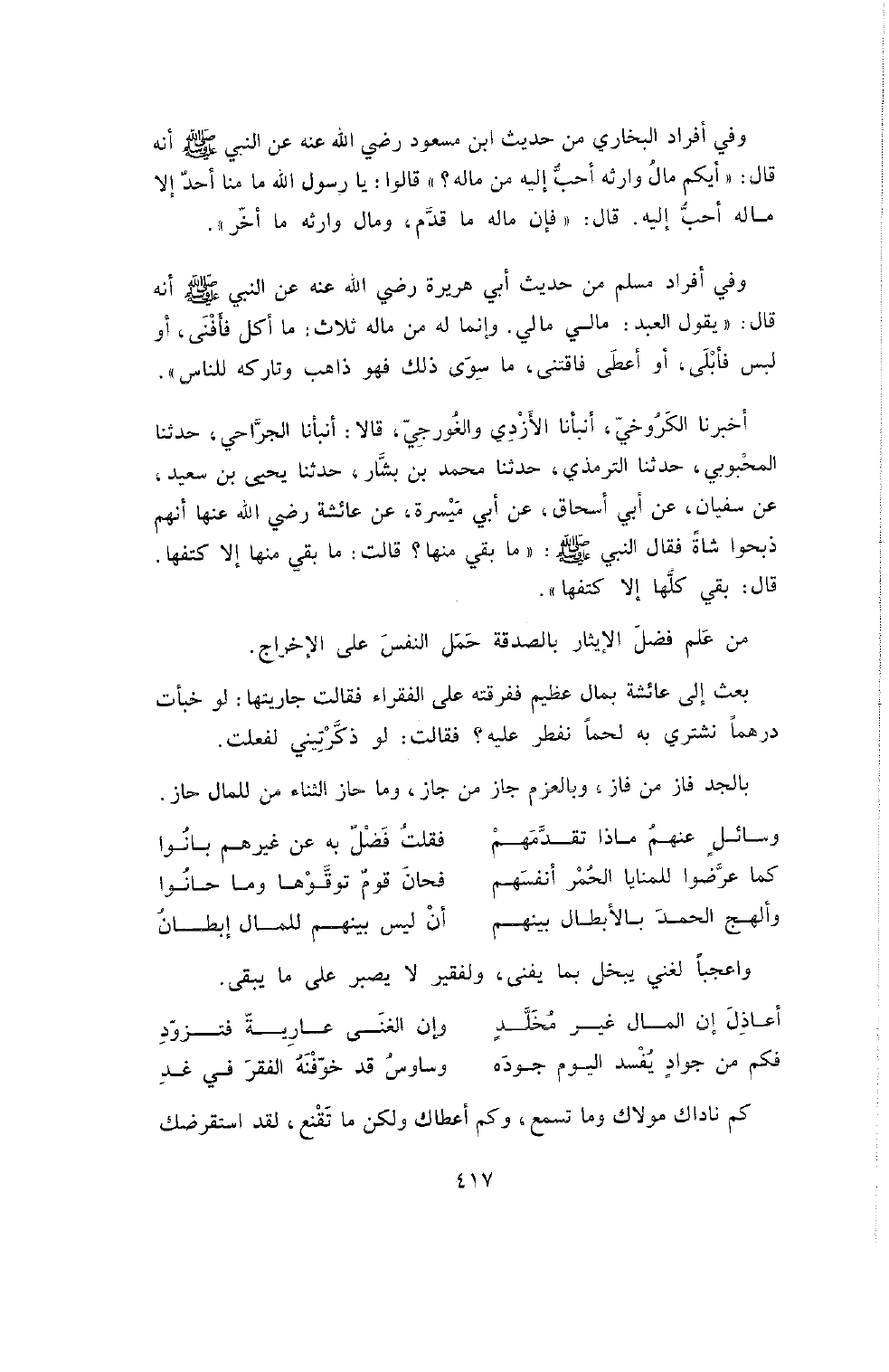 وَفِي أَفْرَادِ الْبُخَارِيِّ مِنْ حَدِيثِ ابْنِ مَسْعُودٍ رَضِيَ اللَّهُ عَنْهُ عَنِ النَّبِيِّ صَلَّى اللَّهُ عَلَيْهِ وَسَلَّمَ أَنَّهُ قَالَ: " أَيُّكُمْ مَالُ وَارِثِهِ أَحَبُّ إِلَيْهِ مِنْ مَالِهِ؟ " قَالُوا: يَا رَسُولَ الله ما منا أحد إلا ما له أَحَبُّ إِلَيْهِ. قَالَ: " فَإِنَّ مَالَهُ مَا قَدَّمَ وَمَالَ وَارِثِهِ مَا أَخَّرَ ".