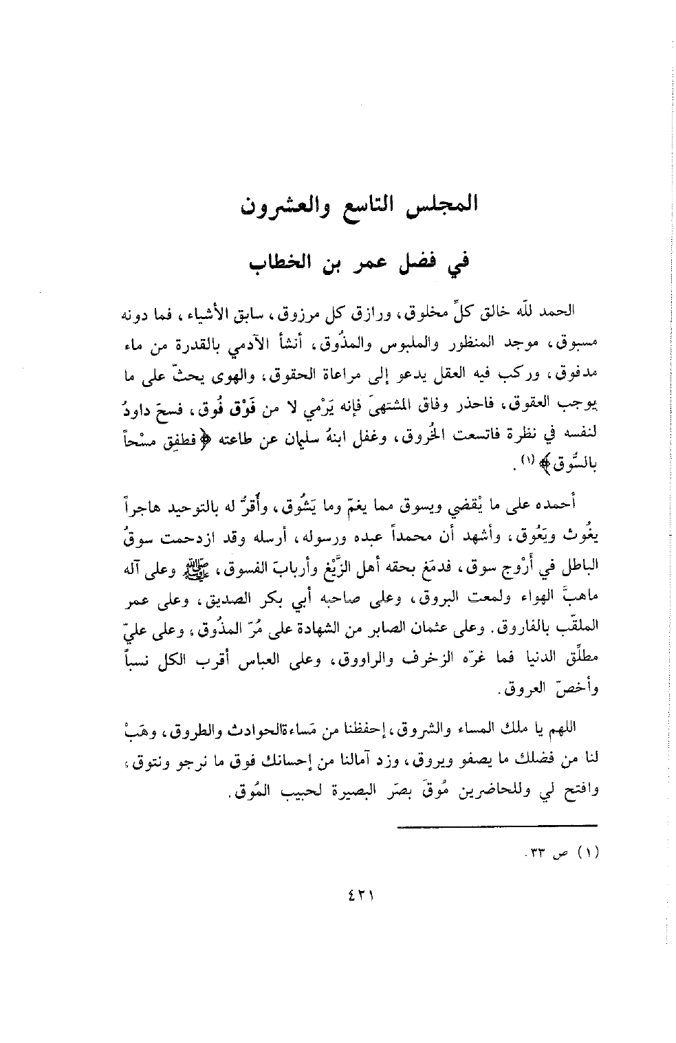 أَحْمَدُهُ عَلَى مَا يَقْضِي وَيَسُوقُ مِمَّا يَغُمُّ وَمَا يَشُوقُ , وَأُقِرُّ لَهُ بِالتَّوْحِيدِ هَاجِرًا يَغُوثَ وَيَعُوقَ , وَأَشْهَدُ أَنَّ مُحَمَّدًا عَبْدُهُ وَرَسُولُهُ , أَرْسَلَهُ وَقَدِ ازْدَحَمَتْ سُوقُ الْبَاطِلِ فِي أَرْوَجِ سُوقٍ , فَدَمَغَ بِحَقِّهِ أَهْلَ الزَّيْغِ وَأَرْبَابَ الْفُسُوقِ , صَلَّى اللَّهُ عَلَيْهِ وَعَلَى آلِهِ مَا هَبَّ الْهَوَاءُ وَلَمَعَتِ الْبُرُوقُ , وَعَلَى صَاحِبِهِ أَبِي بَكْرٍ الصِّدِّيقِ , وَعَلَى عُمَرَ الْمُلَقَّبِ بِالْفَارُوقِ. وَعَلَى عُثْمَانَ الصَّابِرِ مِنَ الشَّهَادَةِ عَلَى مَرِّ الْمُذُوقِ , وَعَلَى عَلِيٍّ مُطَلِّقِ الدُّنْيَا فَمَا غَرَّهُ الزُّخْرُفُ وَالرَّاوُوقُ , وَعَلَى الْعَبَّاسِ أَقْرَبِ الْكُلِّ نَسَبًا وَأَخَصِّ الْعُرُوقِ.
