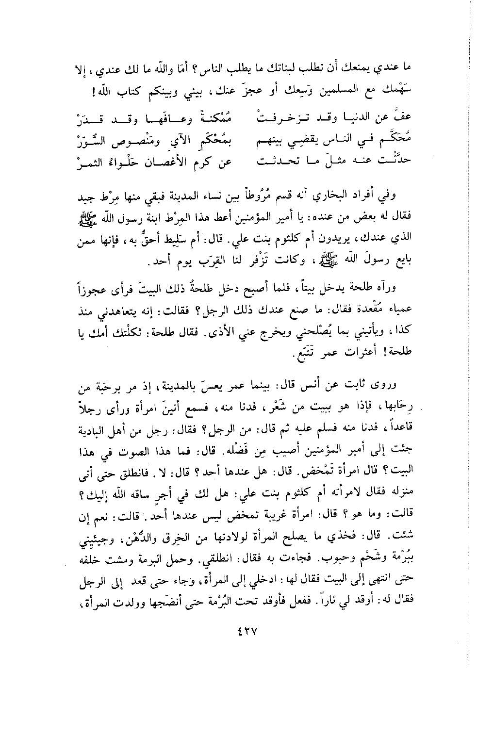 قَالَ: لا. فَانْطَلَقَ حَتَّى أَتَى مَنْزِلَهُ فَقَالَ لامْرَأَتِهِ أُمِّ كُلْثُومٍ بِنْتِ عَلِيٍّ: هَلْ لَكِ فِي أَجْرٍ سَاقَهُ اللَّهُ إِلَيْكِ؟ قَالَتْ: وَمَا هُوَ؟ قَالَ: امْرَأَةٌ غَرِيبَةٌ تَمَخَّضُ لَيْسَ عِنْدَهَا أَحَدٌ. قَالَتْ: نَعَمْ إِنْ شِئْتَ. قَالَ: فَخُذِي مَا يُصْلِحُ الْمَرْأَةَ لِوِلادَتِهَا مِنَ الْخِرَقِ وَالدُّهْنِ وَجِيئِينِي بِبُرْمَةٍ وَشَحْمٍ وَحُبُوبٍ. فَجَاءَتْ بِهِ فَقَالَ: انْطَلِقِي. وَحَمَلَ الْبُرْمَةَ وَمَشَتْ خَلْفَهُ حَتَّى انْتَهَى إِلَى الْبَيْتِ فَقَالَ لَهَا: ادْخُلِي إِلَى الْمَرْأَةِ وَجَاءَ حَتَّى قَعَدَ إِلَى الرَّجُلِ فَقَالَ لَهُ: أَوْقِدْ لِي نَارًا. فَفَعَلَ فَأَوْقَدَ تَحْتَ الْبُرْمَةِ حَتَّى أَنْضَجَهَا وَوَلَدَتِ المرأة ,