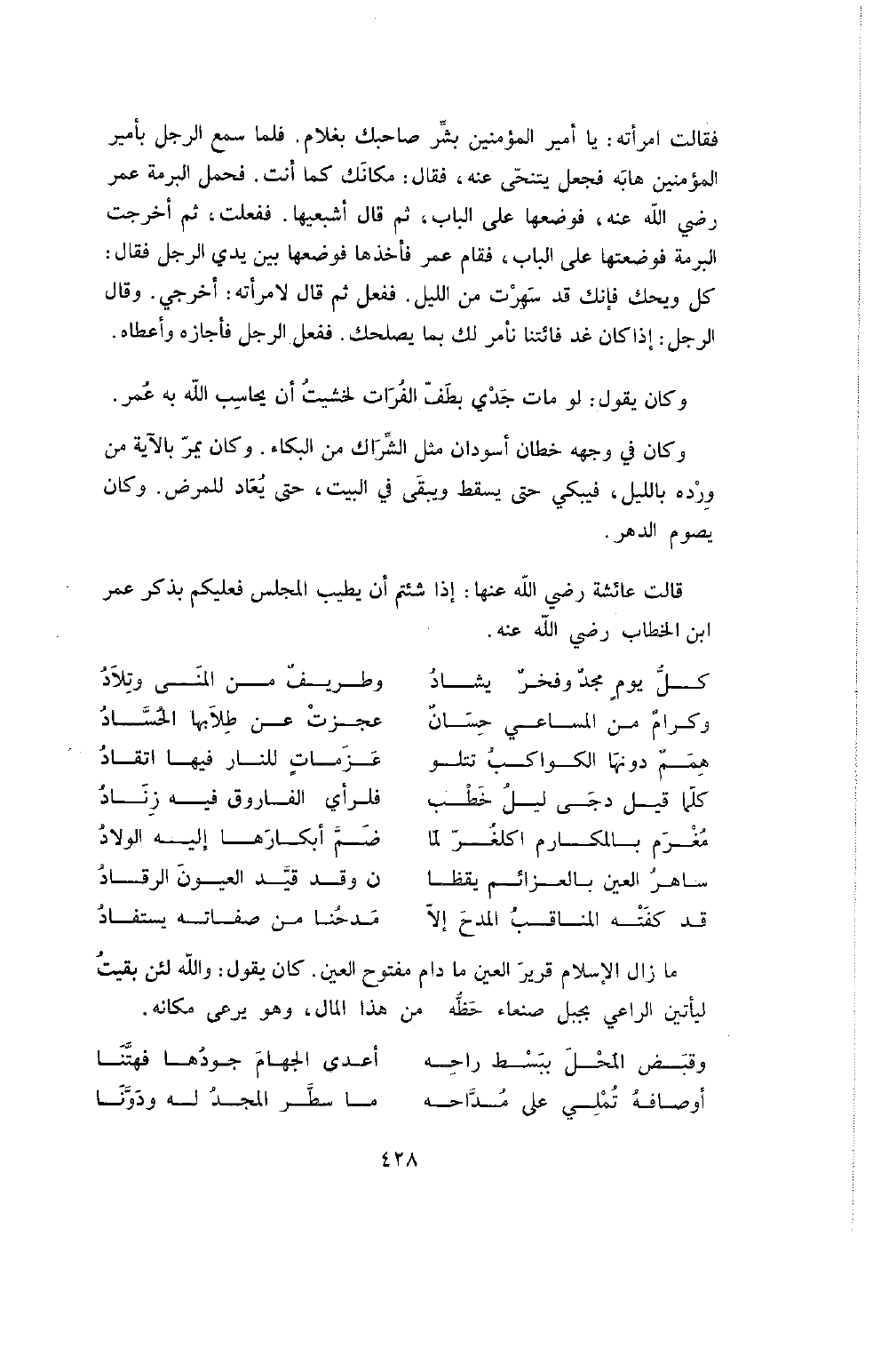 فَقَالَتِ امْرَأَتُهُ: يَا أَمِيرَ الْمُؤْمِنِينَ بَشِّرْ صَاحِبَكَ بِغُلامٍ. فَلَمَّا سَمِعَ الرَّجُلُ بِأَمِيرِ الْمُؤْمِنِينَ هَابَهُ فَجَعَلَ يَتَنَحَّى عَنْهُ , فَقَالَ: مَكَانَكَ كَمَا أَنْتَ. فَحَمَلَ الْبُرْمَةَ عُمَرُ رَضِيَ اللَّهُ عَنْهُ فَوَضَعَهَا عَلَى الْبَابِ ثُمَّ قَالَ: أَشْبِعِيهَا. فَفَعَلَتْ. ثُمَّ أَخْرَجَتِ الْبُرْمَةُ فَوَضَعَتْهَا عَلَى الْبَابِ فَقَامَ عُمَرُ فَأَخَذَهَا فَوَضَعَهَا بَيْنَ يَدَيِ الرَّجُلِ فَقَالَ: كُلْ وَيْحَكَ فَإِنَّكَ قَدْ سَهِرْتَ مِنَ اللَّيْلِ. فَفَعَلَ ثُمَّ قَالَ لامْرَأَتِهِ اخْرُجِي. وَقَالَ لِلرَّجُلِ: إِذَا كَانَ غَدٌ فَائْتِنَا نَأْمُرُ لَكَ بِمَا يُصْلِحُكَ. فَفَعَلَ الرَّجُلُ فَأَجَازَهُ وَأَعْطَاهُ.