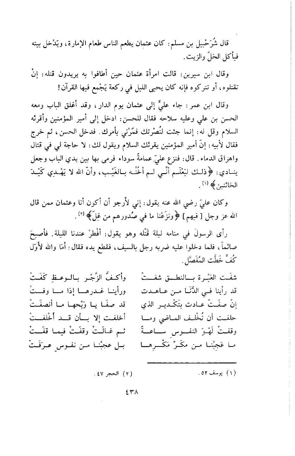وَقَالَ ابْنُ سِيرِينَ قَالَتِ امْرَأَةُ عُثْمَانَ حِينَ أَطَافُوا بِهِ يُرِيدُونَ قَتْلَهُ: إِنْ تَقْتُلُوهُ أَوْ تَتْرُكُوهُ فَإِنَّهُ كَانَ يُحْيِي اللَّيْلَ فِي رَكْعَةٍ يَجْمَعُ فِيهَا الْقُرْآنَ!