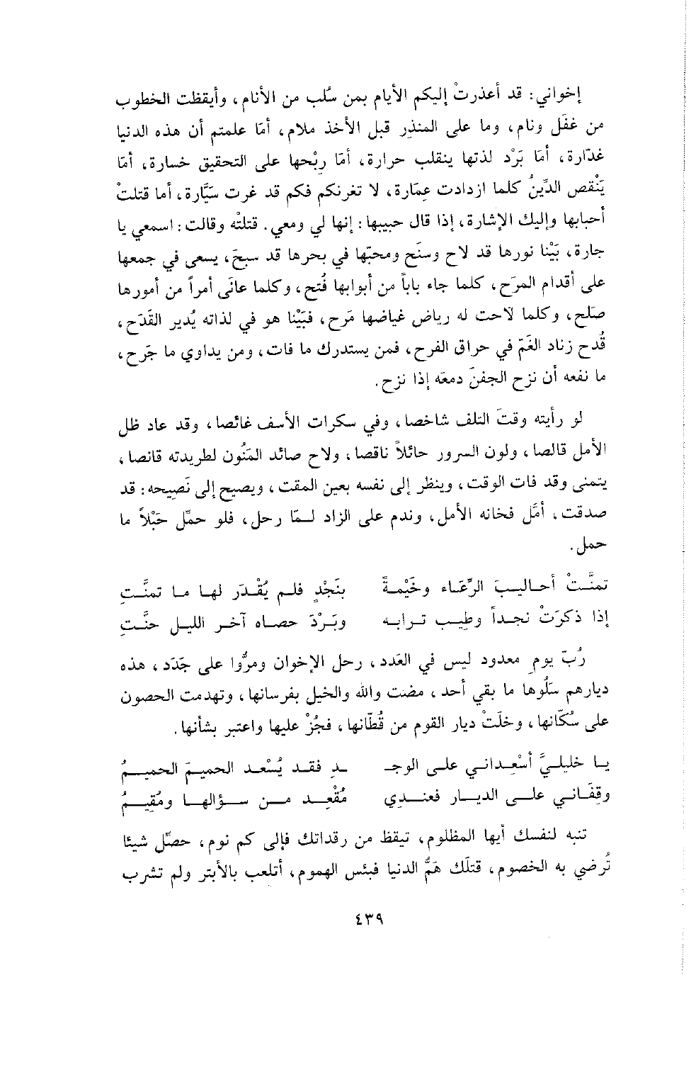 رُبَّ يَوْمٍ مَعْدُودٍ لَيْسَ فِي الْعَدَدِ , رَحَلَ الإِخْوَانُ وَمَرُّوا عَلَى جَدَدٍ , هَذِهِ دِيَارُهُمْ سلوها ما بقي أحد , مضت والله الخيل بِفُرْسَانِهَا , وَتَهَدَّمَتِ الْحُصُونُ عَلَى سُكَّانِهَا , وَخَلَتْ دِيَارُ الْقَوْمِ مِنْ قُطَّانِهَا فَجُزْ عَلَيْهَا وَاعْتَبِرْ بِشَانِهَا.