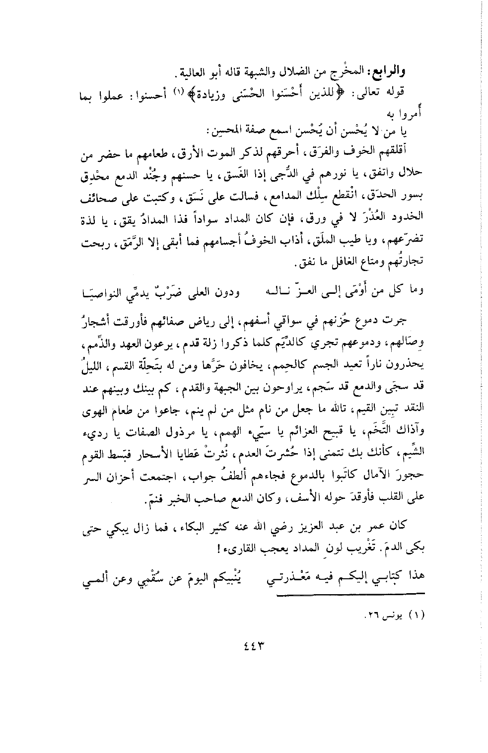 وِصَالِهِمْ , وَدُمُوعُهُمْ تَجْرِي كَالدِّيمِ كُلَّمَا ذَكَرُوا زَلَّةَ قِدَمٍ , يَرْعَوْنَ الْعَهْدَ وَالذِّمَمَ , يَحْذَرُونَ نَارًا تُعِيدُ الْجِسْمَ كَالْحُمَمِ , يَخَافُونَ حَرَّهَا وَمَنْ لَهُ بِتَحِلَّةِ الْقَسَمِ , اللَّيْلُ قَدْ سَجَى وَالدَّمْعُ قَدْ سَجَمَ , يُرَاوِحُونَ بَيْنَ الْجَبْهَةِ وَالْقَدَمِ , كَمْ بَيْنَكَ وَبَيْنَهُمْ عِنْدَ النَّقْدِ تَبِينُ الْقِيَمُ , تَاللَّهِ مَا جُعِلَ مَنْ نَامَ مِثْلَ مَنْ لَمْ يَنَمْ , جَاعُوا مِنْ طَعَامِ الْهَوَى وآذاك التخم , يا قبيح العزائم يا سيىء الْهِمَمِ , يَا مَرْذُولَ الصِّفَاتِ يَا رَدِيءَ الشِّيَمِ , كَأَنَّكَ بِكَ تَتَمَنَّى إِذَا حُشِرْتَ الْعَدَمَ , نُثِرَتْ عَطَايَا الأَسْحَارِ فَبَسَطَ الْقَوْمُ حُجُورَ الآمَالِ كَاتَبُوا بِالدُّمُوعِ فَجَاءَهُمْ أَلْطَفُ جَوَابٍ , اجْتَمَعَتْ أَحْزَانُ السِّرِّ عَلَى الْقَلْبِ فَأُوقِدَ حَوْلَهُ الأَسَفُ , وَكَانَ الدَّمْعُ صَاحِبَ الْخَبَرِ فَنَمَّ.