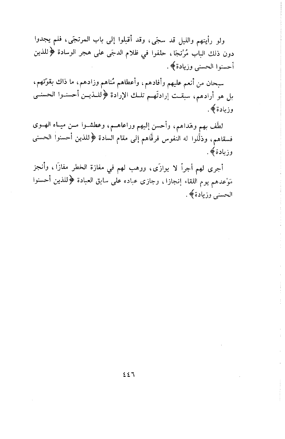 سُبْحَانَ مَنْ أَنْعَمَ عَلَيْهِمْ وَأَفَادَهُمْ , وَأَعْطَاهُمْ مُنَاهُمْ وَزَادَهُمْ , مَا ذَاكَ بِقُوَّتِهِمْ بَلْ هُوَ أَرَادَهُمْ , سَبَقَتْ إِرَادَتَهُمْ تِلْكَ الإِرَادَةُ {لِلَّذِينَ أَحْسَنُوا الْحُسْنَى وزيادة} .