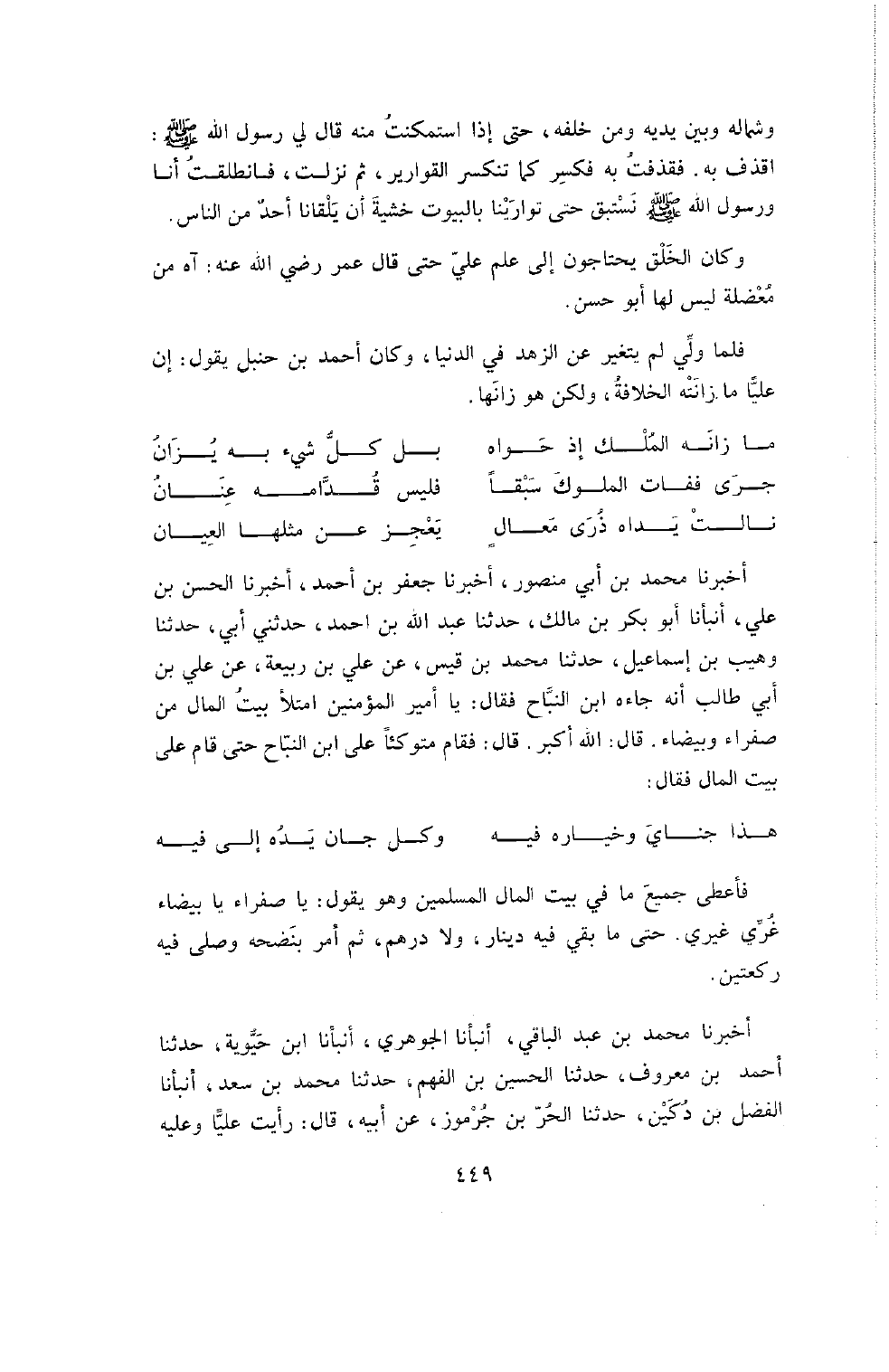 أَخْبَرَنَا مُحَمَّدُ بْنُ أَبِي مَنْصُورٍ , أَخْبَرَنَا جَعْفَرُ بْنُ أَحْمَدَ , أَخْبَرَنَا الْحَسَنُ بْنُ عَلِيٍّ , أَنْبَأَنَا أَبُو بَكْرِ بْنُ مَالِكٍ , حَدَّثَنَا عَبْدُ اللَّهِ بْنُ أَحْمَدَ , حَدَّثَنِي أَبِي , حَدَّثَنَا وُهَيْبُ بْنُ إِسْمَاعِيلَ , حَدَّثَنَا مُحَمَّدُ بْنُ قَيْسٍ , عَنْ عَلِيِّ بْنِ رَبِيعَةَ , عَنْ عَلِيِّ بْنِ أَبِي طَالِبٍ أَنَّهُ جَاءَهُ ابْنُ النَّبَّاحِ فَقَالَ: يَا أَمِيرَ الْمُؤْمِنِينَ امْتَلأَ بَيْتُ الْمَالِ مِنْ صَفْرَاءَ وَبَيْضَاءَ. قَالَ: اللَّهُ أَكْبَرُ. قَالَ: فَقَامَ مُتَوَكِّئًا عَلَى ابْنِ النَّبَّاحِ حَتَّى قَامَ عَلَى بَيْتِ الْمَالِ فَقَالَ: