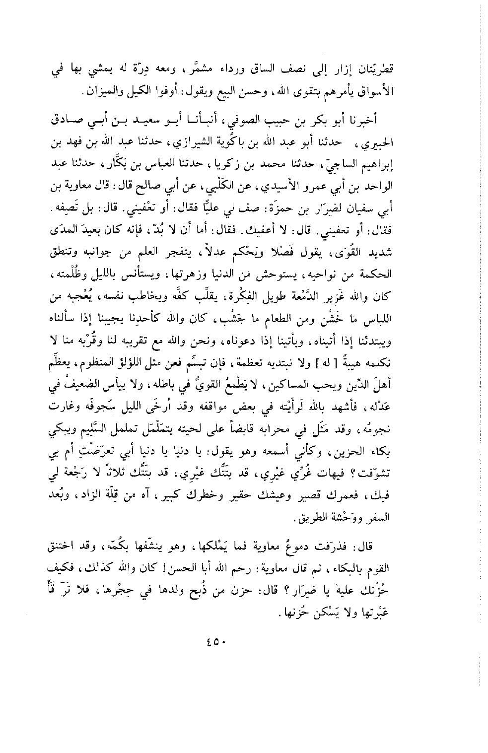 أَخْبَرَنَا أَبُو بَكْرِ بْنُ حَبِيبٍ الصُّوفِيُّ , أَنْبَأَنَا أَبُو سَعِيدِ بْنُ أَبِي صَادِقٍ الْحَبِيرِيُّ , حَدَّثَنَا أَبُو عَبْدِ اللَّهِ بْنُ بَاكَوِيَةَ الشِّيرَازِيُّ , حَدَّثَنَا عَبْدُ اللَّهِ بْنُ فَهْدِ بْنِ إِبْرَاهِيمَ السَّاجِيُّ , حَدَّثَنَا مُحَمَّدُ بْنُ زَكَرِيَّا , حَدَّثَنَا الْعَبَّاسُ بْنُ بَكَّارٍ , حَدَّثَنَا عَبْدُ الْوَاحِدِ بْنُ أَبِي عَمْرٍو الأسيدِيُّ , عَنِ الْكَلْبِيِّ , عَنْ أَبِي صَالِحٍ قَالَ: قَالَ مُعَاوِيَةُ بْنُ أَبِي سُفْيَانَ لِضِرَارِ بْنِ حمزة: صف لي علياً فقال: أو تعفني. قال: بل تصفه. فقال: أو تعفني. قَالَ: لا أُعْفِيكَ. فَقَالَ: أَمَا أَنْ لا بُدَّ فَإِنَّهُ كَانَ بَعِيدَ الْمَدَى شَدِيدَ الْقُوَى , يَقُولُ فَصْلا وَيَحْكُمُ عَدْلا , يَتَفَجَّرُ الْعِلْمُ مِنْ جَوَانِبِهِ وَتَنْطِقُ الْحِكْمَةُ مِنْ نَوَاحِيهِ , يَسْتَوْحِشُ مِنَ الدُّنْيَا وَزَهْرَتِهَا , وَيَسْتَأْنِسُ بِاللَّيْلِ وَظُلْمَتِهِ , كَانَ وَاللَّهِ غَزِيرَ الدَّمْعَةِ طَوِيلَ الْفِكْرَةِ , يَقْلِبُ كَفَّهُ وَيُخَاطِبُ نَفْسَهُ , يُعْجِبُهُ مِنَ اللِّبَاسِ مَا خَشُنَ وَمِنَ الطَّعَامِ مَا جَشَبَ , كَانَ وَاللَّهِ كَأَحَدِنَا يُجِيبُنَا إِذَا سَأَلْنَاهُ وَيَبْتَدِئُنَا إِذَا أَتَيْنَاهُ , وَيَأْتِينَا إِذَا دَعَوْنَاهُ , وَنَحْنُ وَاللَّهِ مَعَ تَقْرِيبِهِ لَنَا وَقُرْبِهِ مِنَّا لا نُكَلِّمُهُ هَيْبَةً [لَهُ] وَلا نَبْتَدِيهِ تَعْظِمَةً , فَإِنْ تَبَسَّمَ فَعَنْ مِثْلِ اللُّؤْلُؤِ الْمَنْظُومِ , يُعَظِّمُ أَهْلَ الدِّينِ وَيُحِبُّ الْمَسَاكِينَ , لا يَطْمَعُ القوي في باطله ولا ييأس الضَّعِيفُ مِنْ عَدْلِهِ , فَأَشْهَدُ بِاللَّهِ لَرَأَيْتُهُ فِي بَعْضِ مَوَاقِفِهِ وَقَدْ أَرْخَى اللَّيْلُ سُجُوفَهُ وَغَارَتْ نُجُومُهُ , وَقَدْ مَثُلَ فِي مِحْرَابِهِ قَابِضًا عَلَى لِحْيَتِهِ يَتَمَلْمَلُ تَمَلْمُلَ السَّلِيمِ وَيَبْكِي بُكَاءَ الْحَزِينِ وَكَأَنِّي أَسْمَعُهُ وَهُوَ يَقُولُ: يَا دُنْيَا
