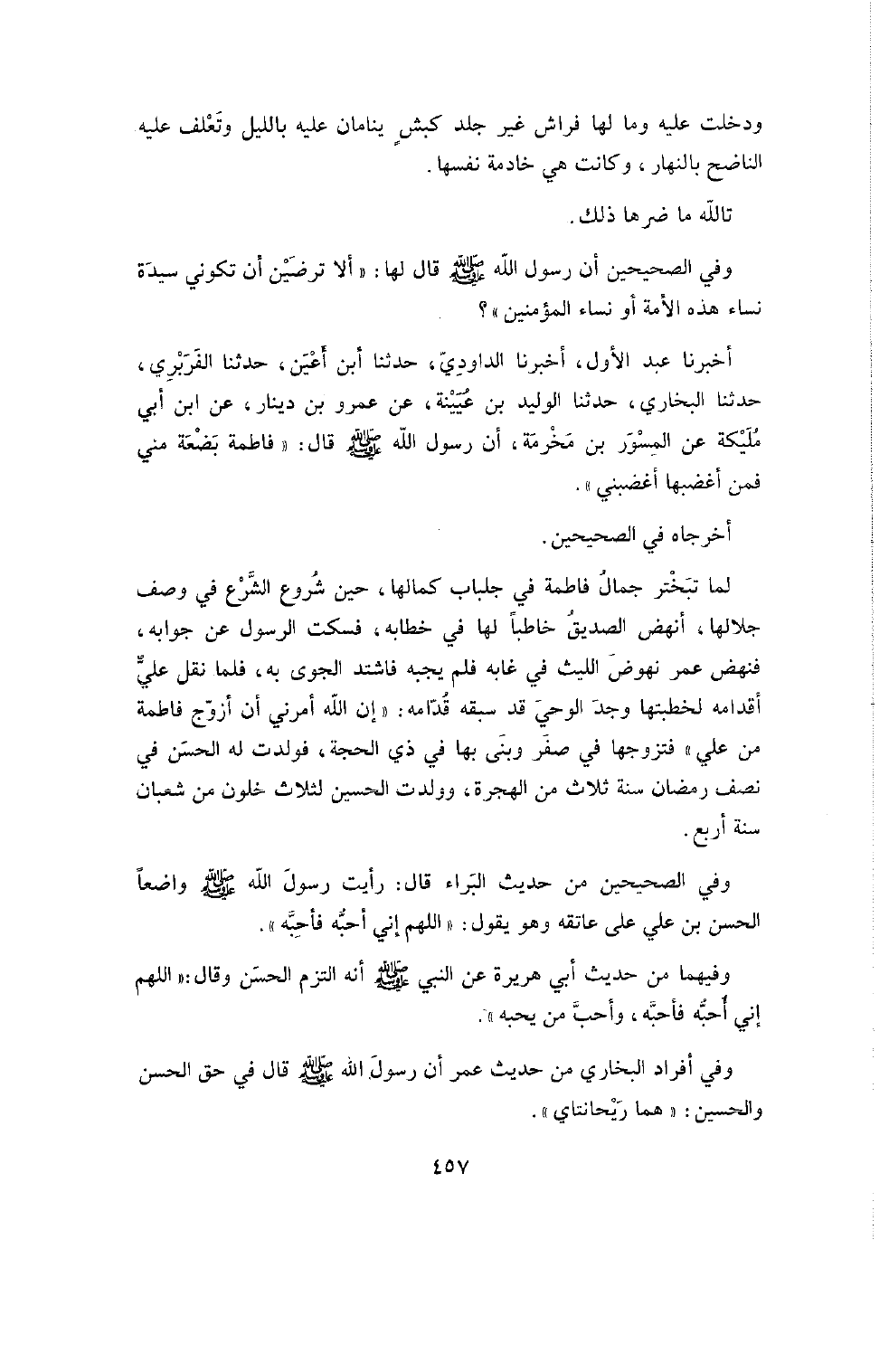وَفِي الصَّحِيحَيْنِ أَنَّ رَسُولَ اللَّهِ صَلَّى اللَّهُ عَلَيْهِ وَسَلَّمَ قَالَ لَهَا: " أَلَا تَرْضِينَ أَنْ تَكُونِي سَيِّدَةَ نِسَاءِ هَذِهِ الأُمَّةِ أَوْ نِسَاءِ الْمُؤْمِنِينَ ".