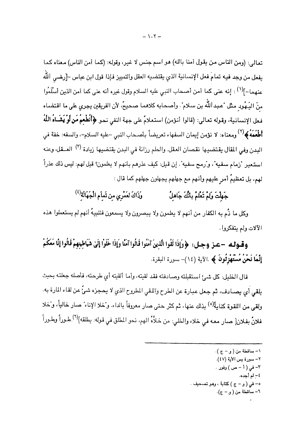وأصحابه كلاهما صحيح، لأن الفريقين يجري على ما اقتضاه فعل الإنسانية، وقوله تعالى: {قَالُوا أَنُؤْمِنُ} استعلام على جهة النفي نحو {أَنُطْعِمُ مَنْ لَوْ يَشَاءُ اللَّهُ أَطْعَمَهُ} ومعناه: لا نؤمن إيمان السفهاء تعريضاً بأصحاب النبي - عليه السلام - والسفيه: خفة في البدن وفي المقال يقتضيها نقصان العقل، والحلم رزانة في البدن يقتضيها زيادة العقل، وعنه استعير " زمام سفيه "، و " رمح سفيه "،