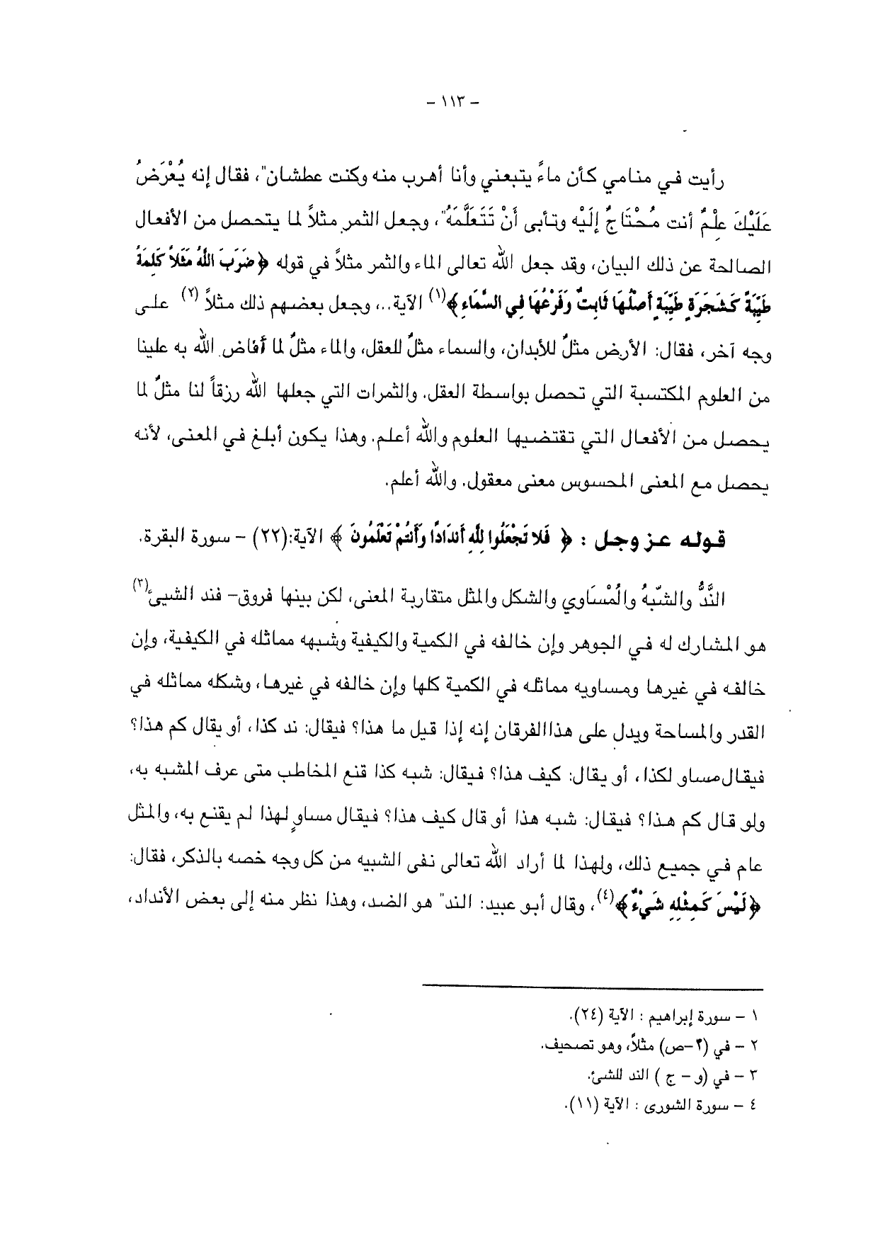 الند والشبه والمساوي والشكل والمثل متقاربة المعنى، لكن بيناه فروق - فند الشيء هو المشارك له في الجوهر وإن خالفه في الكمية والكيفية وشبهه مماثله في الكيفية، وإن خالفه في غيرها ومساويه مماثله في الكمية كلها وإن خالفه في غيرها، وشكله مماثله في القدر والمساحة ويدل على هذا الفرقان إنه إذا قيل ما هذا؟ فيقال: ند كذا، أو يقال كم هذا؟ فيقال مساو لكذا، أو يقال: كيف هذا؟ فيقال: شبه كذا قنع المخاطب متى عرف المشبه به، ولو قال كم هذا؟ فيقال: شبه هذا أو قال كيف هذا؟ فيقال مساو لهذا لم يقنع به، والمثل عام في جميع ذلك، ولهذا لما أراد الله تعالى نفي الشبيه من كل وجه خصه بالذكر، فقال: {لَيْسَ كَمِثْلِهِ شَيْءٌ} وقال أبو عبيد: الند " هو الضد، وهذا نظر منه إلى بعض الأنداد،