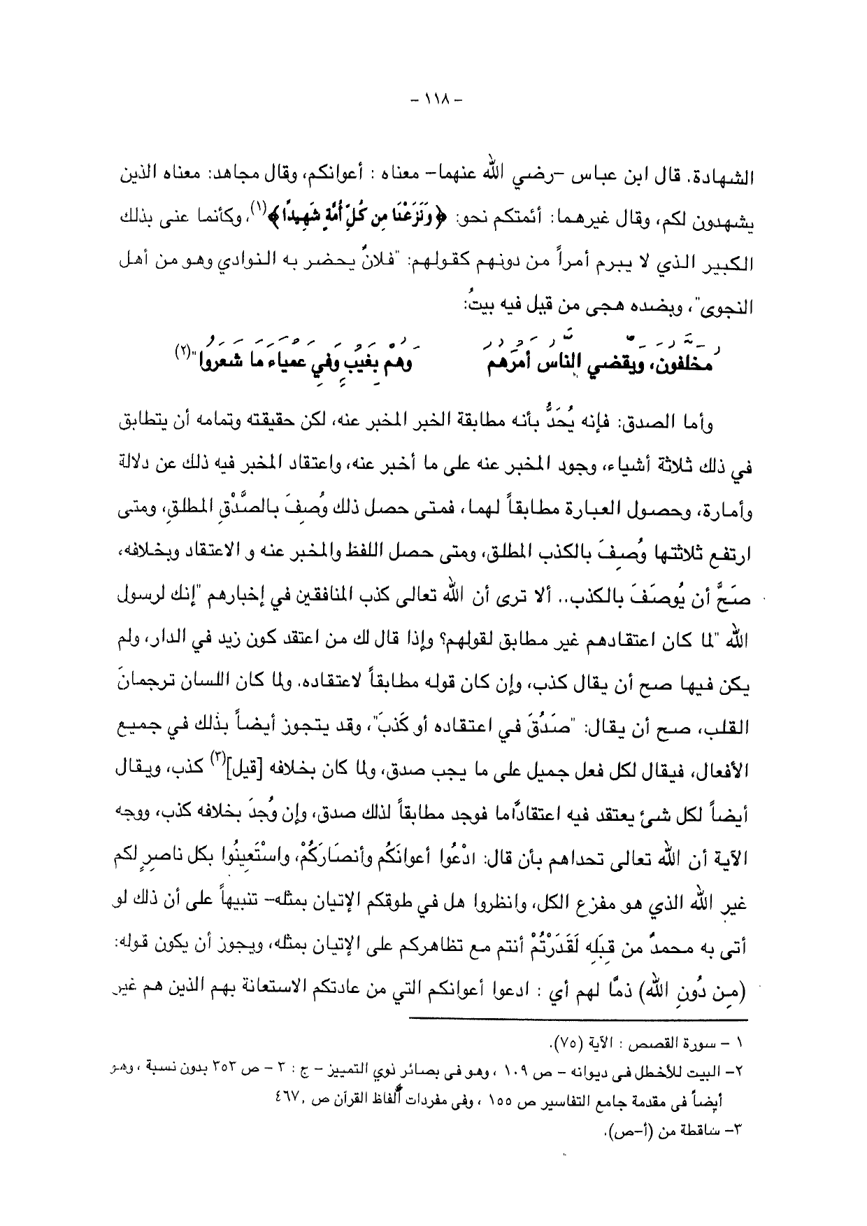 ألا ترى أن الله تعالى كذب المنافقين في إخبارهم " إنك لرسول الله " لما كان اعتقادهم غير مطابق لقولهم؟ وإذا قال لك من أعتقد كون زيد في الدار، ولم يكن فيها صح أن يقال كذب، وإن كان قوله مطابقاً لاعتقاده، ولما كان اللسان ترجمان القلب، صح أن يقال: " صح في اعتقاده أو كذب "، وقد يتجوز أيضاً بذلك في جميع الأفعال، فيقال لكل فعل جميل على ما يجب صدق، ولما كان بخلافه [قيل] كذب، ويقال أيضاً لكل شيء يعتقد فيه اعتقاداً ما فوجد مطابقاً لذلك صدق، وإن وجد بخلافه كذب، ووجه الآية أن الله تعالى تحداهم بأن قال: " ادعوا أعوانكم وأنصاركم " وأستعينوا بكل ناصر لكم غير الله الذي هو مفزع الكل، وانظروا هل فب طوقكم الإتيان بمثله - تنبيهاً على أن ذلك لو أتى به محمد من قبله لقدرتم أنتم مع تظاهركم على الإتيان بمثله، ويحوز أن يكون قوله: {مِنْ دُونِ اللَّهِ} ذماً لهم أي: ادعوا أعوانكم التي من عادتكم الاستعانة بهم الذين هو غير