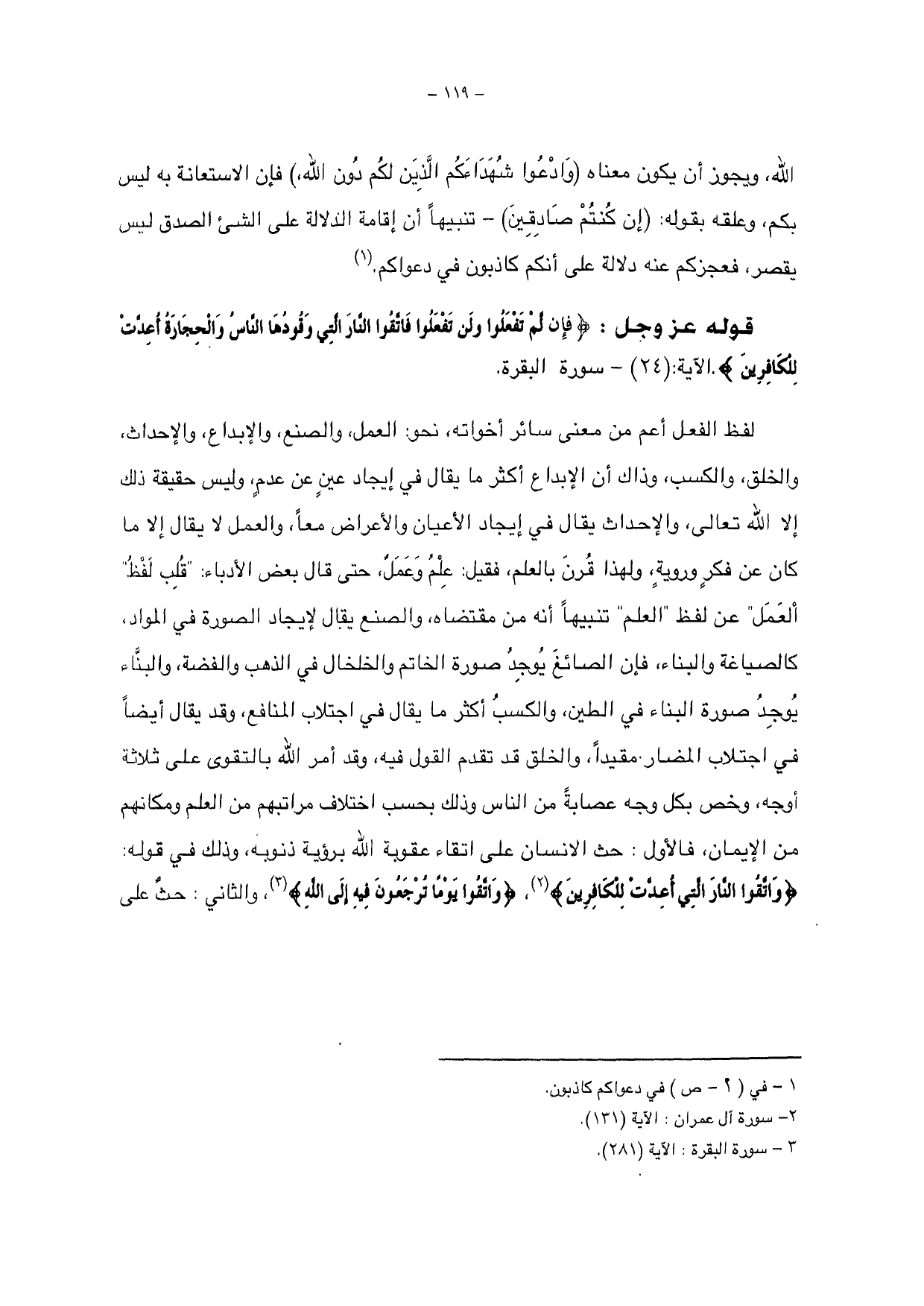 لفظ الفعل أعم من معنى سائر أخواته، نحو: العمل، والصنع، والإبداع، والإحداث، والخلق والكسب وذاك أن الإبداع أكثر ما يقال في إيجاد عين عن عدم، وليس حقيقة ذلك إلا الله تعالى، والأحداث يقال في إيجاد الأعيان والأعراض معاً، والعمل لا يقال إلا ما كان عن فكر وروية، ولهذا قرن بالعلم، فقيل: علم وعمل، حتى قال بعض الأدباء: " قلب لفظ " العمل عن لفظ " العلم " تنبيهاً أنه من مقتضاه، والصنع يقال لإيجاد الصورة في المواد كالصياغة والبناء فإن الصائغ يوجد صورة الخاتم والخلخال في الذهب والفضة، والبناء يوجد صورة البناء في الطين، والكسب أكثر ما يقال في اجتلاب المنافع، وقد يقال أيضاً في اجتلاب المضار مقيداً، والخلق قد تقدم القول فيه، وقد أمر الله بالتقوى على ثلاثة أوجه، وخص بكل وجه عصابة من الناس وذلك بحسب اختلاف مراتبهم من العلم ومكانهم من الإيمان، فالأول: حث الإنسان على اتقاء عقوبة الله برؤية ذنوبه، وذلك في قوله: {وَاتَّقُوا النَّارَ الَّتِي أُعِدَّتْ لِلْكَافِرِينَ}، {وَاتَّقُوا يَوْمًا تُرْجَعُونَ فِيهِ إِلَى اللَّهِ} والثاني: حث على
