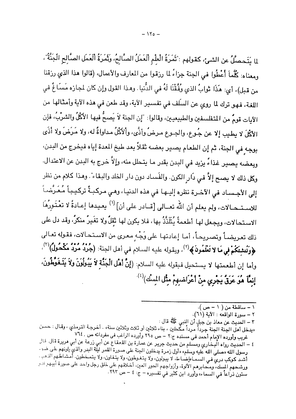 وهذا القول وإن كان لمجازه مساغ في اللغة، فهو ترك لما روي عن السلف في تفسير الآية، وقد طعن في هذه الآية وأمثالها من الآيات قوم من المتفلسفين والطبيعيين، وقالوا: " إن الجنة لا يصح فيها الأكل والشرب، فإن الأكل لا يطيب إلا عن جوع، والجوع مرض وأذى، والأكل مداواة له، ولا مرض ولا أذى بوجه في الجنة، ثم إن الطعام يصير بعضه ثقلاً بعد طبخ المعدة إياه فيخرج من البدن، وبعضه يصير غذاء يزيد في البدن بقدر ما يتحلل منه، وإلا خرج به البدن عن الاعتدال.