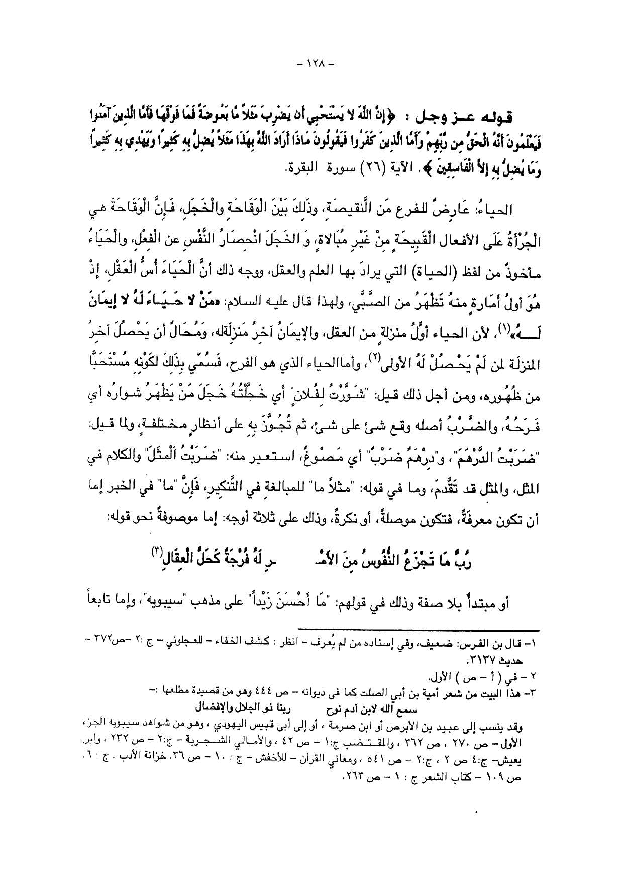 الحياءُ: عارض للفرع من النقيصة، وذلك بين الوقاحة والخجل، فإن الوقاحة هي الجرأة على الإعال القبيحة من غير مبالاة، والخجل انحصار النفس عن الفعل، والحياء مأخوذة من لفظ (الحياة) التر يراد بها العلم والعقل، ووجه ذلك أن الحياء أسُّ العقل، إذ هو أول أمارة منه تظهر من الصبي، ولهذا قال عليه السلام: " من لا حياء له لا إيمان له "، لأن الحياء أول منزلة من العقل، والإيمان آخر منزلة له، ومحال أن يحصل آخر المنزلة لمن لم يحصل له الأولى، وأما الحياء الذي هو الفرح، فسمي بذلك لكونه مستحباً من ظهورة، ومن أجل ذلك قيل: " شورتُ لفلان " أي خَجَّلتُهُ خجل من يظهر شوارهُ أي فرحُةُ والضربُ أصله وقع شيء على شيء ثم تجوز به على أنظار مختلفة، ولما قيل: " ضربتُ الدرهم "، و " درهمٌ ضربٌ " أي مصوغ، استعير منه: " ضربت المثل " والكلام في المثل، والمثل قد تقدم، وما في قوله: " مثلاً ما " للمبالغة في التنكير، فإن " ما " في الخبر إما أن تكون معرفة، فتكون موصلة، أو نكرة، وذلك على ثلاثة أوجة: إما موصوفة نحو قوله: