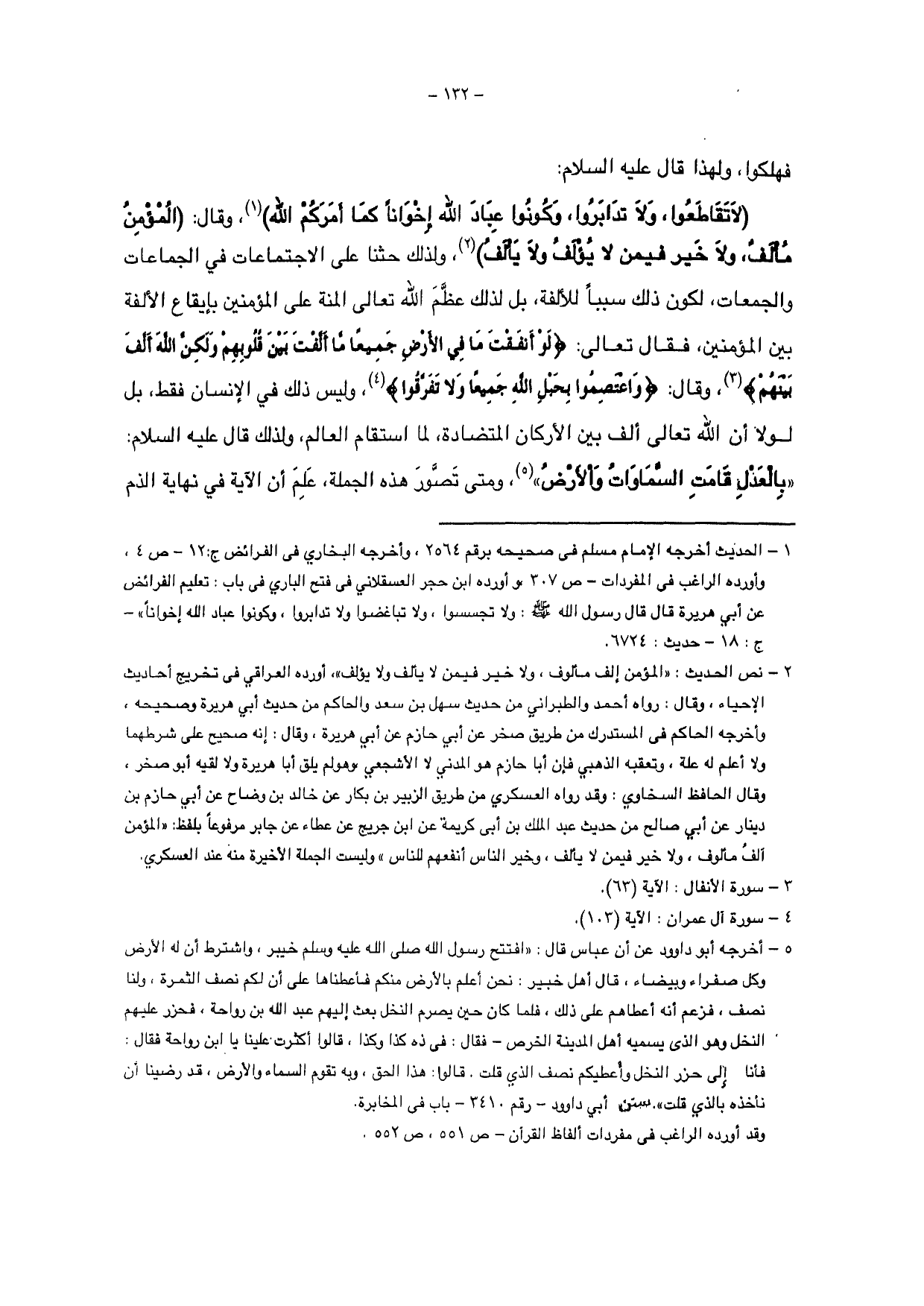 (لا تقاطعوا، ولا تدابروا، وكونوا عباد الله إخواناً كما أمركم الله) وقال: (المؤمن مألف، ولا خير فيمن لا يؤلف ولا يألف)، ولذلك حثنا على الاجتماعات في الجماعات والجمعات، لكون ذلك سبباً للألفة، بل لذلك عظم الله تعالى المنة على المؤمنين بإيقاع الألفة بين المؤمنين، فقال تعالى: {لَوْ أَنْفَقْتَ مَا فِي الْأَرْضِ جَمِيعًا مَا أَلَّفْتَ بَيْنَ قُلُوبِهِمْ وَلَكِنَّ اللَّهَ أَلَّفَ بَيْنَهُمْ} وقال: {وَاعْتَصِمُوا بِحَبْلِ اللَّهِ جَمِيعًا وَلَا تَفَرَّقُوا} وليس ذلك في الإنسان فقط، بل لولا أن الله تعالى الف بين الأركان المتضادة، لما استقام العالم، ولذلك قال عليه السلام: " بالعدل قامت السماوات والأرض " ومتى تصور هذه الجملة، علم أن الآية في نهاية الذم